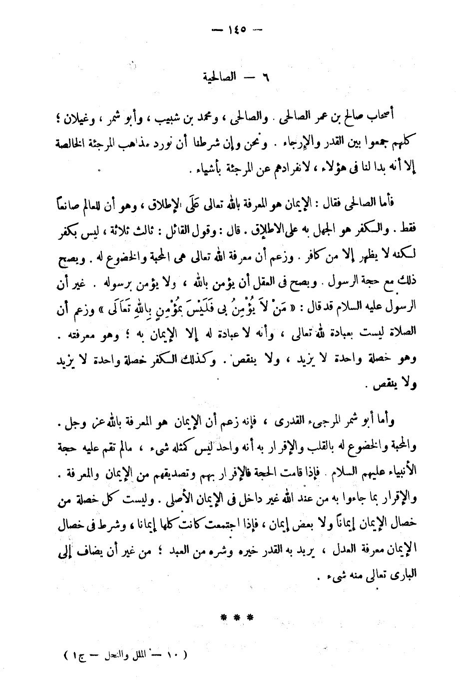أصحاب صالح بن عمر الصالحي, والصالحي، ومحمد بن شبيب، وأبو شمر، وغيلان؛ كلهم جمعوا بين القدر والإرجاء. ونحن وإن شرطنا أن نورد مذاهب المرجئة الخالصة إلا أنه بدا لنا في هؤلاء، لانفرادهم عن المرجئة بأشياء.