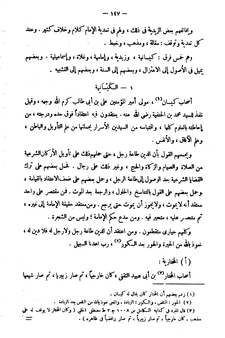 أصحاب كيسان1، مولى أمير المؤمنين علي بن أبي طالب كرم الله وجهه، وقيل تلمذ للسيد محمد بن الحنفية رضي الله عنه. يعتقدون فيه اعتقادا فوق حده ودرجته، من إحاطته بالعلوم كلها، واقتباسه من السيدين الأسرار بجملتها من علم التأويل والباطن، وعلم الآفاق والأنفس.