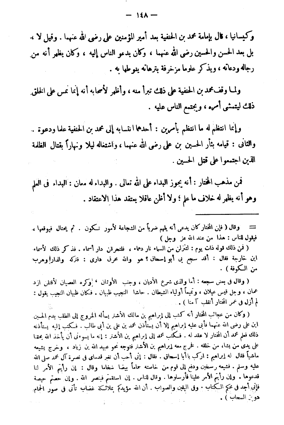 وإنما انتظم له ما انتظم بأمرين: أحدهما انتسابه إلى محمد بن الحنفية علما ودعوة والثاني: قيامه بثأر الحسين بن علي رضي الله عنهما، واشتغاله ليلا ونهارا بقتال الظلمة الذين اجتمعوا على قتل الحسين.