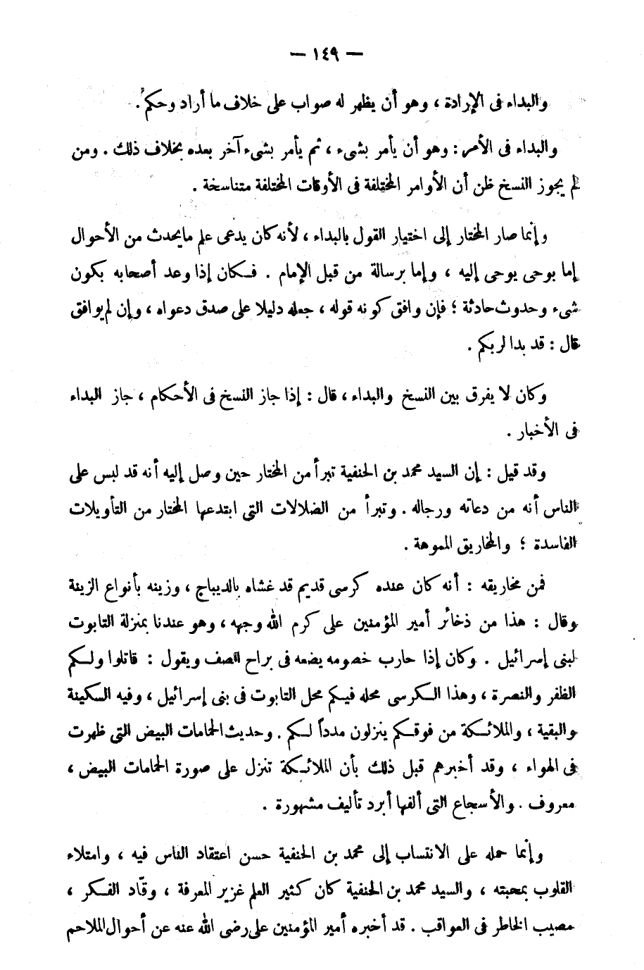 وقد قيل: إن السيد محمد بن الحنفية تبرأ من المختار حين وصل إليه أنه قد لبس على الناس أنه من دعاته ورجاله. وتبرأ من الضلالات التي ابتدعها المختار من التأويلات الفاسدة؛ والمخاريق المموهة.