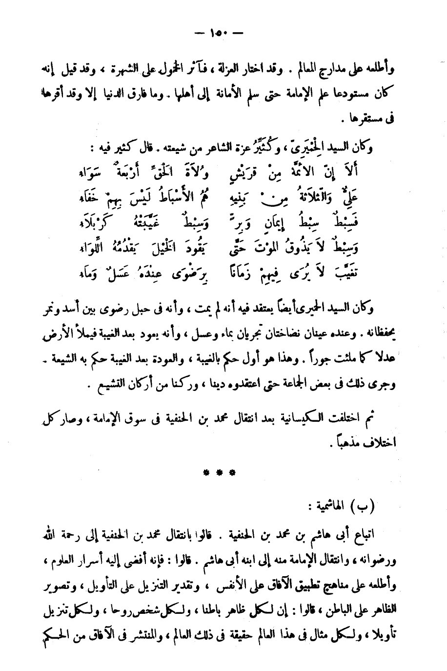 أتباع أبي هاشم بن محمد بن الحنفية. قالوا بانتقال محمد بن الحنفية إلى رحمة الله ورضوانه، وانتقال الإمامة منه إلى ابنه أبي هاشم. قالوا: فإنه أفضى إليه أسرار العلوم، وأطلعه على مناهج تطبيق الآفاق على الأنفس، وتقدير التنزيل على التأويل، وتصوير الظاهر على الباطن، قالوا: إن لكل ظاهر باطنا، ولكل شخص روحا، ولكل تنزيل تأويلا، ولكل مثال في هذا العالم حقيقة في ذلك العالم، والمنتشر في الآفاق من الحكم