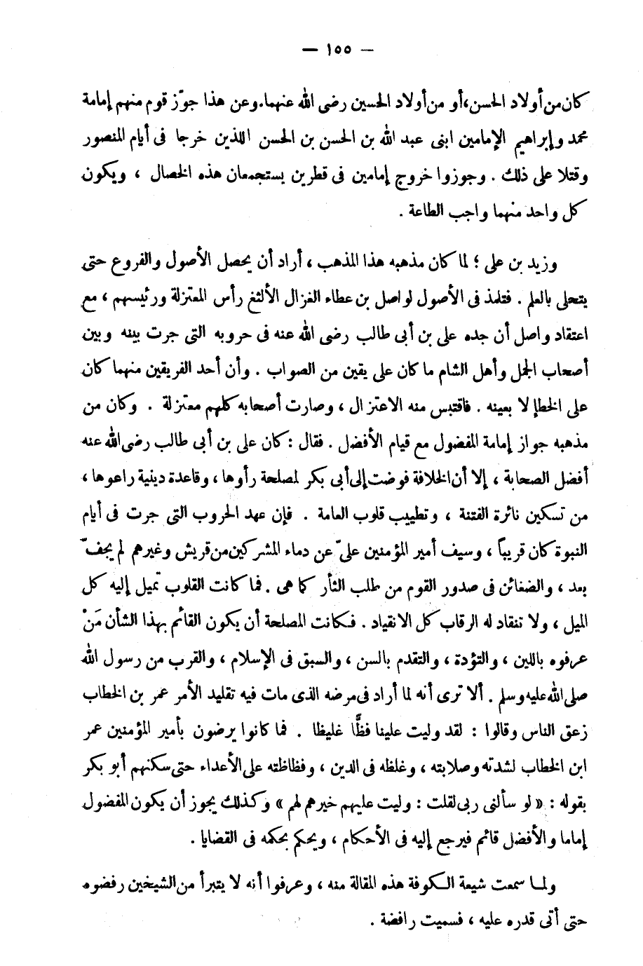 كان من أولاد الحسن، أو من أولاد الحسين رضي الله عنهما. وعن هذا جوز قوم منهم إمامة محمد وإبراهيم الإمامين ابني عبد الله بن الحسن بن الحسن اللذين خرجا في أيام المنصور وقتلا على ذلك. وجوزوا خروج إمامين في قطرين يستجمعان هذه الخصال، ويكون كل واحد منهما واجب الطاعة.