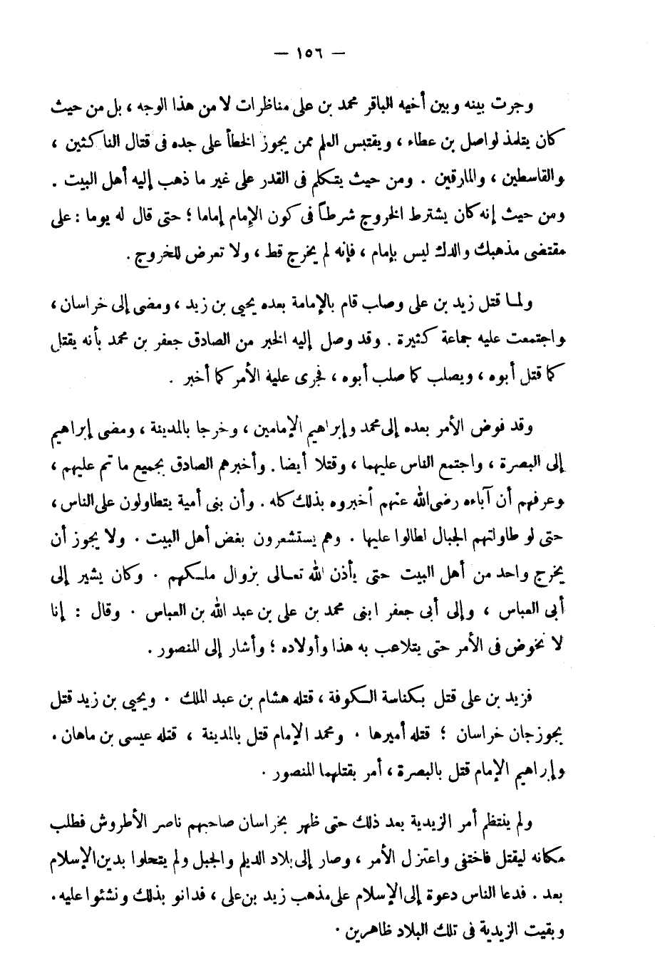 وجرت بينه وبين أخيه الباتقر محمد بن علي مناظرات لا من هذا الوجه، بل من حيث كان يتلمذ لواصل بن عطاء، ويقتبس العلم ممن يجوز الخطأ على جده في قتال الناكثين، والقاسطين، والمارقين. ومن حيث يتكلم في القدر على غير ما ذهب إليه أهل البيت. ومن حيث إنه كان يشترط الخروج شرطا في كون الإمام إماما؛ حتى قال له يوما: على مقتضى مذهبك والدك ليس بإمام، فإنه لم يخرج قط، ولا تعرض للخروج.