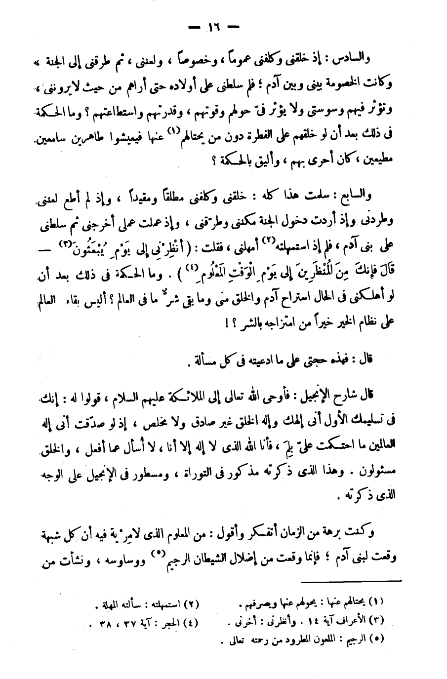 قال شارح الإنجيل: فأوحى الله تعالى إلى الملائكة عليهم السلام، قولوا له: إنك في تسليمك الأول أني إلهك وإله الخلق غير صادق ولا مخلص، إذ لو صدقت أني إله العالمين ما احتكمت علي بلم، فأنا الله الذي لا إله إلا أنا، لا أسأل عما أفعل، والخلق مسئولون. وهذا الذي ذكرته مذكور في التوراة، ومسطور في الإنجيل على الوجه الذي ذكرته.