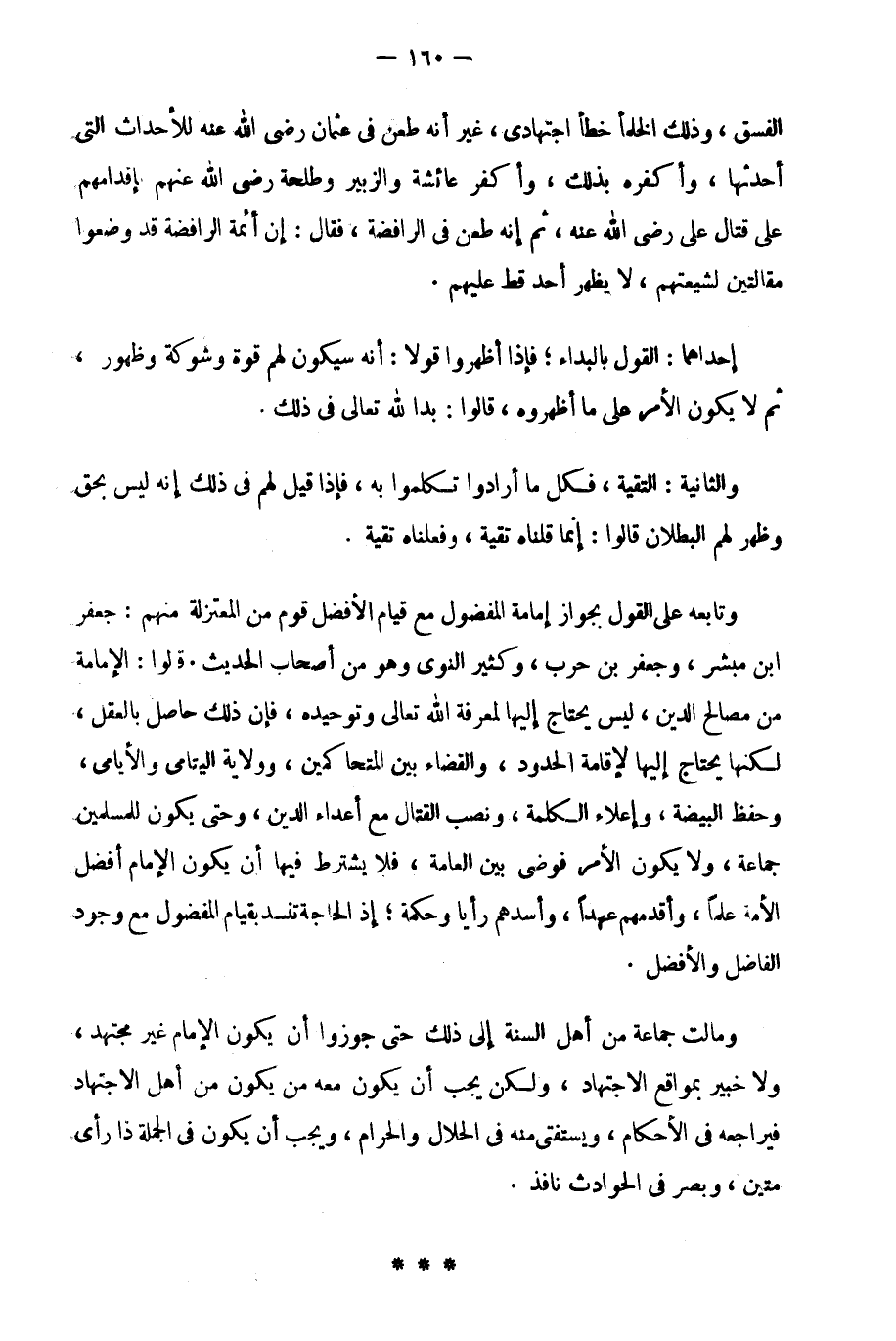 الفسق، وذلك الخلمأ خطأ اجتهادي، غير أنه طعن في عثمان رضي الله عنه للأحداث التي أحدثها، وأكفره بذلك، وأكفر عائشة والزبير وطلحة رضي الله عنهم بإقدامهم على قتال علي رضي الله عنه، ثم إنه طعن في الرافضة، فقال: إن أئمة الرافضة قد وضعوا مقالتين لشيعتهم، لا يظهر أحد قط عليهم.