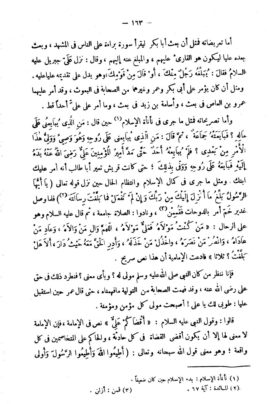 وأما تصريحاته فمثل ما جرى في نأنأة الإسلام1 حين قال: من الذي يبايعني على ماله؟ فبايعته جماعة، ثم قال: من الذي يبايعني على روحه وهو وصي وولي هذا الأمر من بعدي؟ فلم يبايعه أحد حتى مد أمير المؤمنين علي رضي الله عنه يده إليه فبايعه على روحه ووفى بذلك؛ حتى كانت قريش تعير أبا طالب أنه أمر عليك ابنك. ومثل ما جرى في كمال الإسلام وانتظام الحال حين نزل قوله تعالى: {يَا أَيُّهَا الرَّسُولُ بَلِّغْ مَا أُنْزِلَ إِلَيْكَ مِنْ رَبِّكَ وَإِنْ لَمْ تَفْعَلْ فَمَا بَلَّغْتَ رِسَالَتَهُ} 2 فلما وصل غدير خم أمر بالدوحات فقممن3، ونادوا: الصلاة جامعة، ثم قال عليه السلام وهو على الرحال: "من كنت مولاه فعلي مولاه، اللهم وال من والاه، وعاد من عاداه، وانصر من نصره، واخذل من خذله، وأدر الحق معه حيث دار، ألا هل بلغت؟ ثلاثا" فادعت الإمامية أن هذا نص صريح.