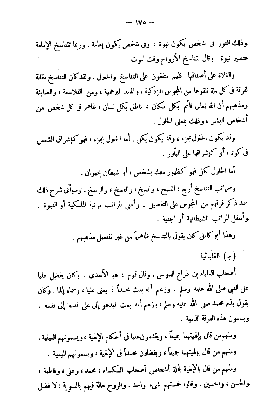 والغلاة على أصنافها كلهم متفقون على التناسخ والحلول. ولقد كان التناسخ مقالة لفرقة في كل ملة تلقوها من المجوس المزدكية، والهند البرهمية، ومن الفلاسفة، والصابئة ومذهبهم أن الله تعالى قائم بكل مكان، ناطق بكل لسان، ظاهر في كل شخص من أشخاص البشر، وذلك بمعنى الحلول.