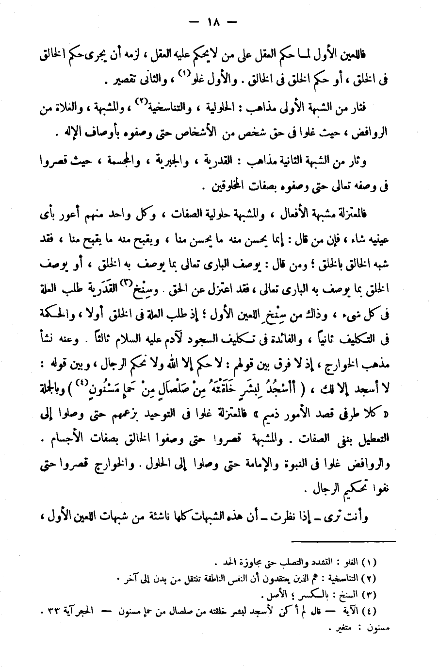 فثار من الشبهة الأولى مذاهب: الحلولية، والتناسخية2، والمشبهة، والغلاة من الروافض، حيث غلوا في حق شخص من الأشخاص حتى وصفوه بأوصاف الإله.