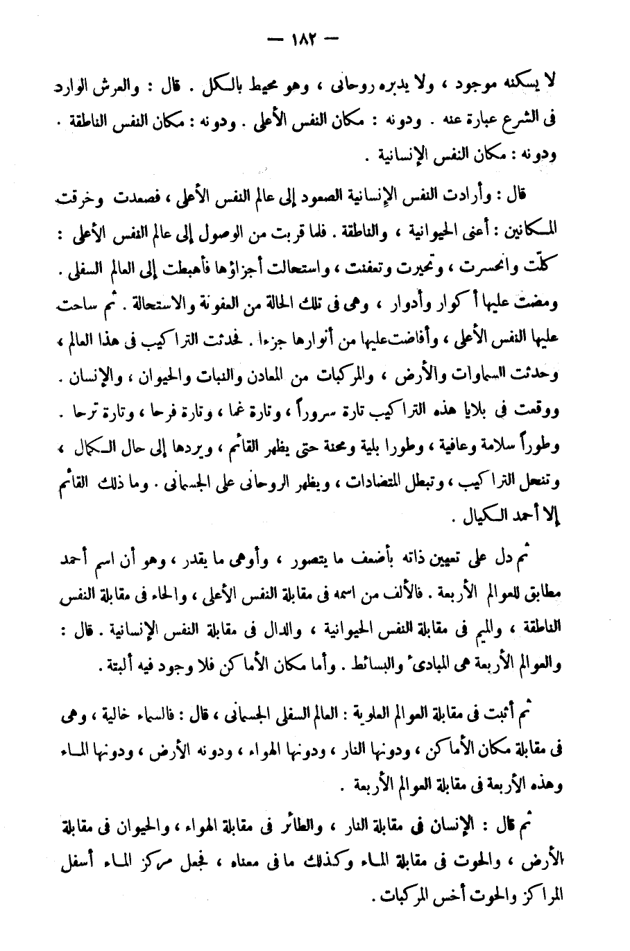 ثم أثبت في مقابلة العوالم العلوية: العالم السفلي الجسماني، قال: فالسماء خالية، وهي في مقابلة مكان الأماكن، ودونها النار، ودونها الهواء، ودونه الأرض، ودونها الماء وهذه الأربعة في مقابلة العوالم الأربعة.