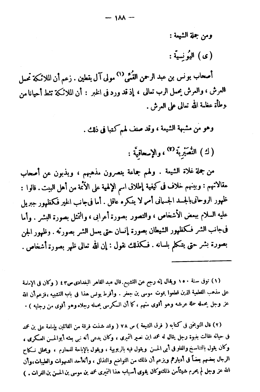 أصحاب يونس بن عبد الرحمن القمي1 مولى آل يقطين. زعم أن الملائكة تحمل العرش، والعرش يحمل الرب تعالى، إذ قد ورد في الخبر: أن الملائكة تئط أحيانا من وطأة عظمة الله تعالى على العرش.