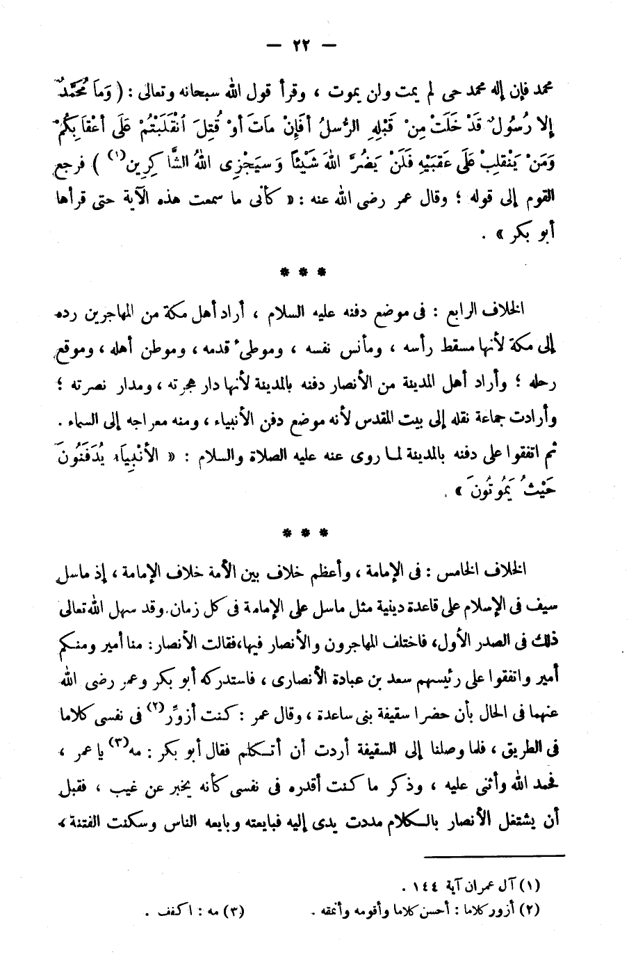 الخلاف الخامس: في الإمامة، وأعظم خلاف بين الأمة خلاف الإمامة، إذ ما سل سيف في الإسلام على قاعدة دينية مثل ما سل على الإمامة في كل زمان. وقد سهل الله تعالى ذلك في الصدر الأول، فاختلف المهاجرون والأنصار فيها، فقالت الأنصار: منا أمير ومنكم أمير واتفقوا على رئيسهم سعد بن عبادة الأنصاري، فاستدركه أبو بكر وعمر رضي الله عنهما في الحال بأن حضرا سقيفة بني ساعدة، وقال عمر: كنت أزور2 في نفسي كلاما في الطريق، فلما وصلنا إلى السقيفة أردت أن أتكلم فقال أبو بكر: مه3 يا عمر، فحمد الله وأثنى عليه، وذكر ما كنت أقدره في نفسي كأنه يخبر عن غيب، فقبل أن يشتغل الأنصار بالكلام مددت يدي إليه فبايعته وبايعه الناس وسكنت الفتنة،
