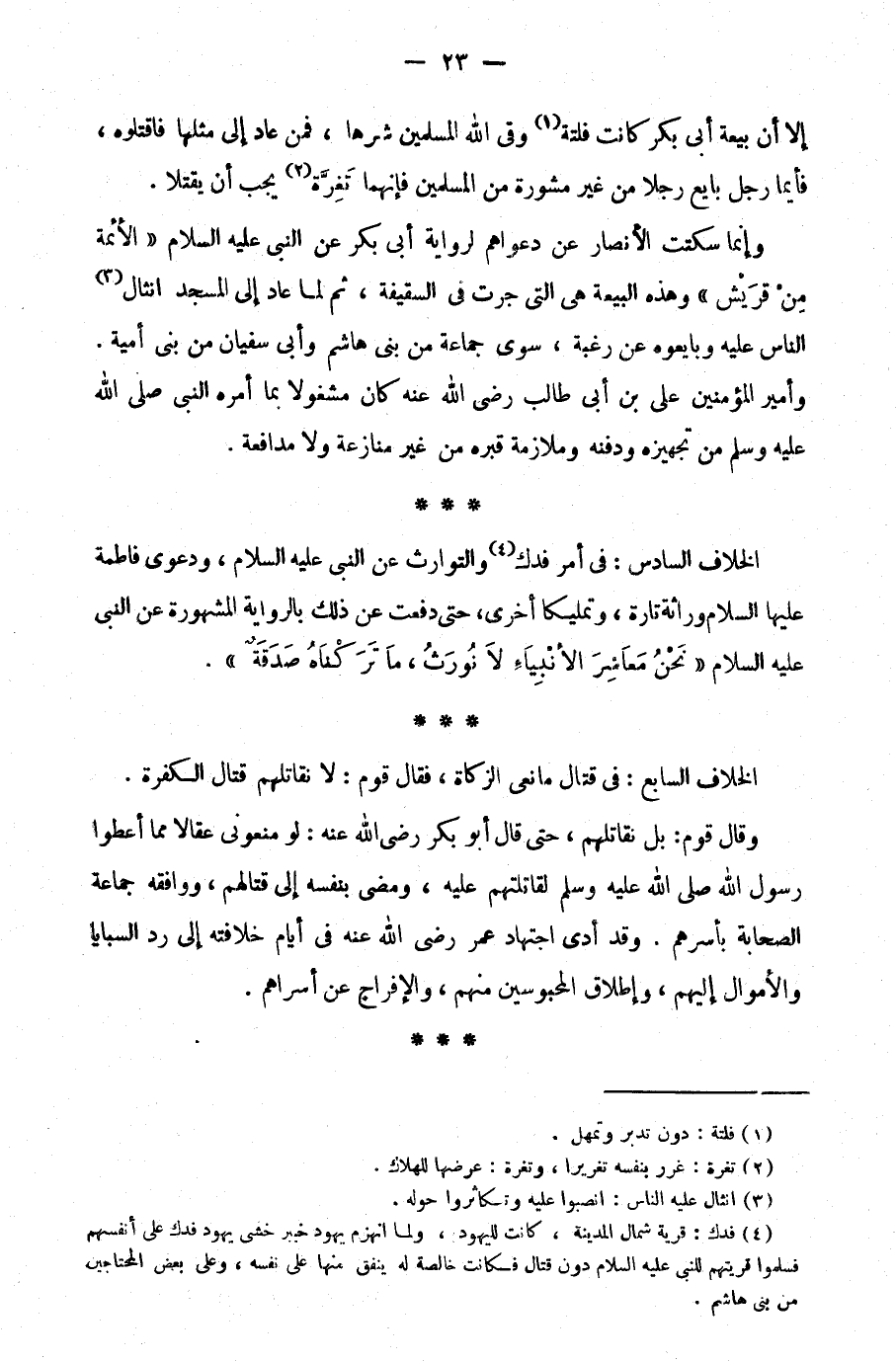 الخلاف السادس: في أمر فدك4 والتوارث عن النبي عليه السلام، ودعوى فاطمة عليها السلام وراثة تارة، وتمليكا أخرى، حتى دفعت عن ذلك بالرواية المشهورة عن النبي عليه السلام: "نحن معاشر الأنبياء لا نورث، ما تركناه صدقة".