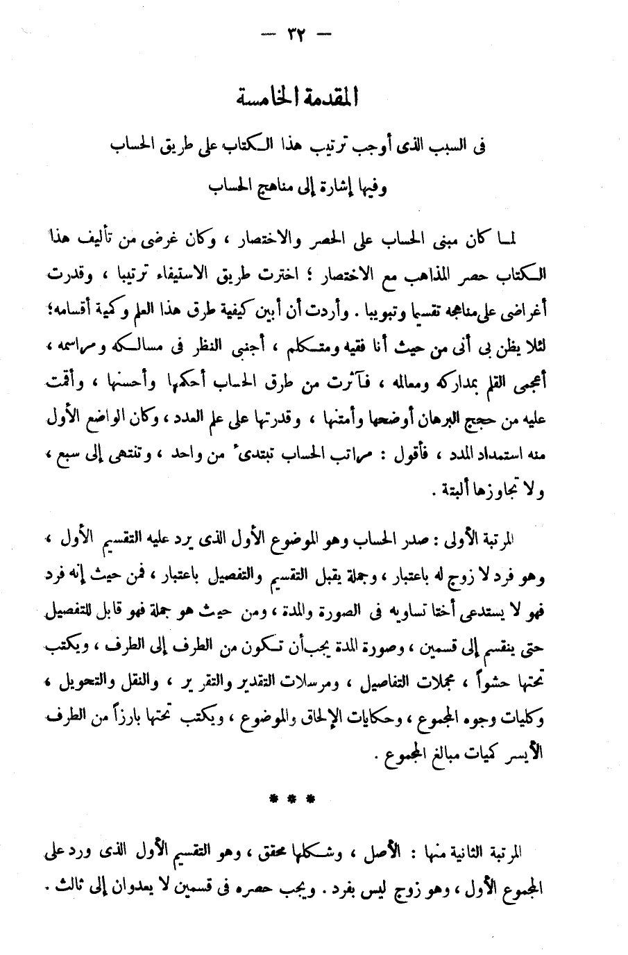 لما كان مبنى الحساب على الحصر والاختصار، وكان غرضي من تأليف هذا الكتاب حصر المذاهب مع الاختصار؛ اخترت طريق الاستيفاء ترتيبا، وقدرت أغراضي على مناهجه تقسيما وتبويبا. وأردت أن أبين كيفية طرق هذا العلم وكمية أقسامه؛ لئلا يظن بي أني من حيث أنا فقيه ومتكلم، أجنبي النظر في مسالكه ومراسمه، أعجمي القلم بمداركه ومعالمه، فآثرت من طرق الحساب أحكامها وأحسنها، وأقمت عليه من حجج البرهان أوضحها وامتنها، وقدرتها على علم العدد، وكان الواضع الأول منه استمداد المدد، فأقول: مراتب الحساب تبتدئ من واحد، وتنتهي إلى سبع، ولا تجاوزها ألبتة.