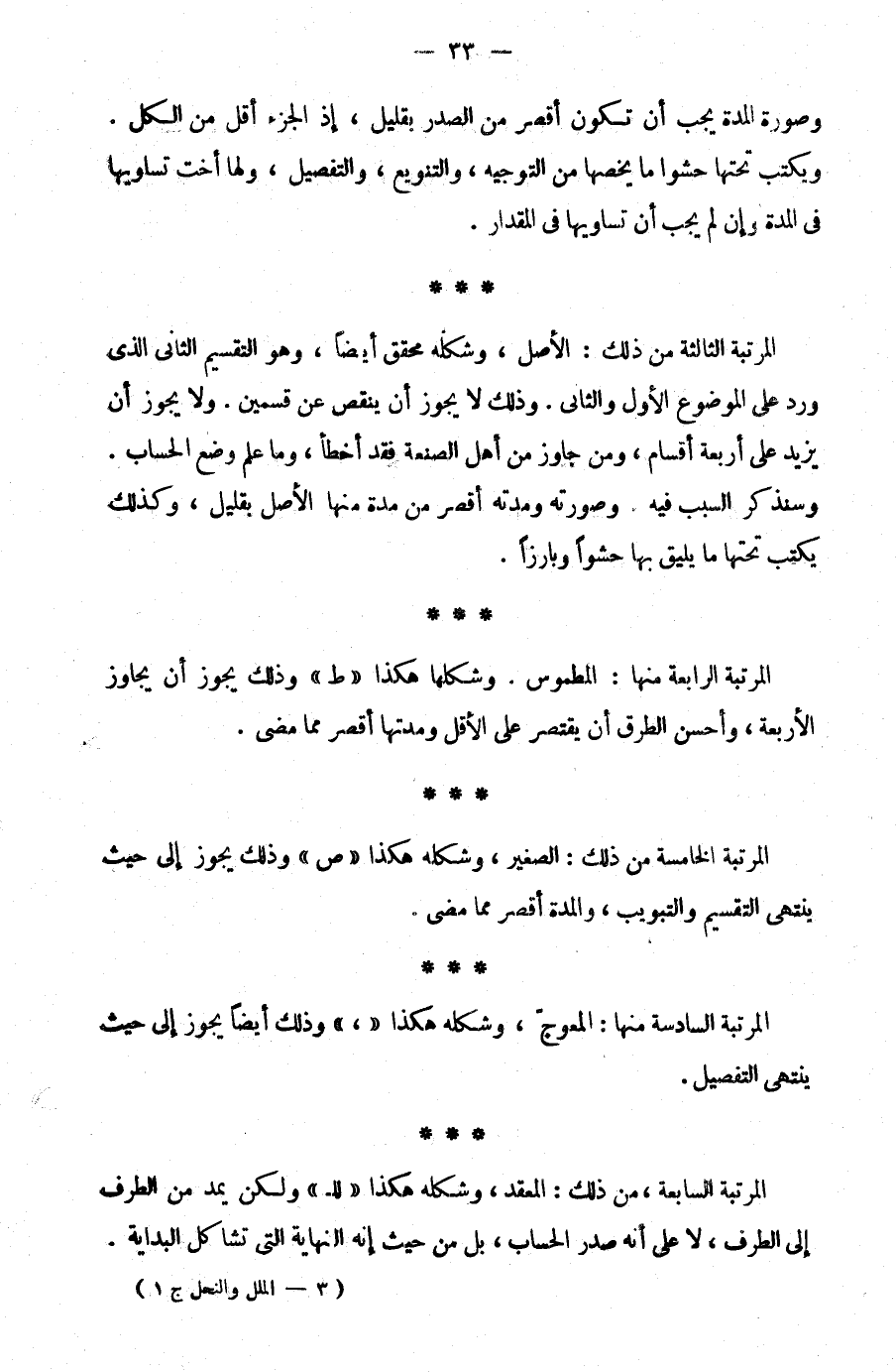 المرتبة الثالثة من ذلك: الأصل، وشكله محقق أيضا، وهو التقسيم الثاني الذي ورد على الموضوع الأول والثاني. وذلك لا يجوز أن ينقص عن قسمين. ولا يجوز أن يزيد على أربعة أقسام، ومن جاوز من أهل الصنعة فقد أخطأ، وما علم وضع الحساب. وسنذكر السبب فيه. وصورته ومدته أقصر من مدة منها الأصل بقليل، وكذلك يكتب تحتها ما يليق بها حشوا وبارزا.