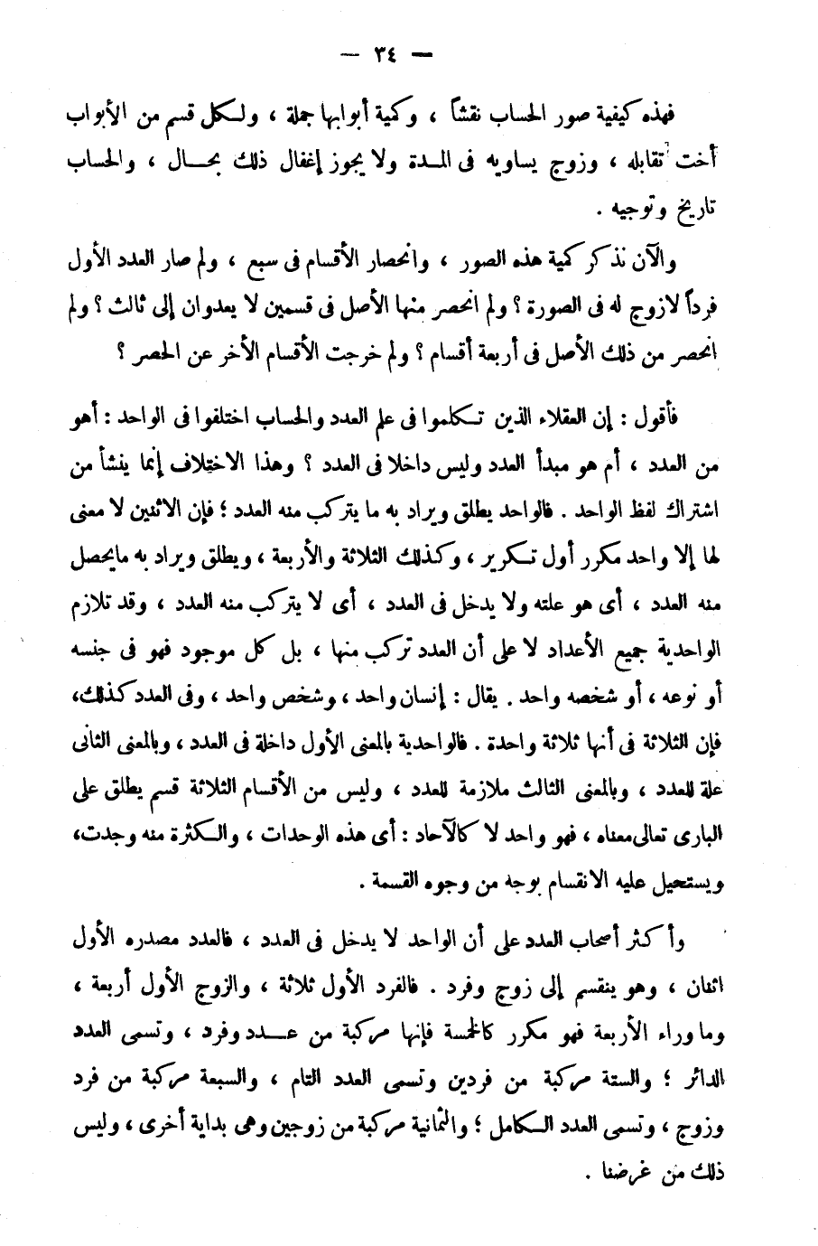 وأكثر أصحاب العدد على أن الواحد لا يدخل في العدد، فالعدد مصدره الأول اثنان، وهو ينقسم إلى زوج وفرد. فالفرد الأول ثلاثة، والزوج الأول أربعة، وما وراء الأربعة فهو مكرر كالخمسة فإنها مركبة من عدد وفرد، وتسمى العدد الدائر؛ والستة مركبة من فردين وتسمى العدد التام، والسبعة مركبة من فرد وزوج، وتسمى العدد الكامل؛ والثمانية مركبة من زوجين وهي بداية أخرى، وليس ذلك من غرضنا.