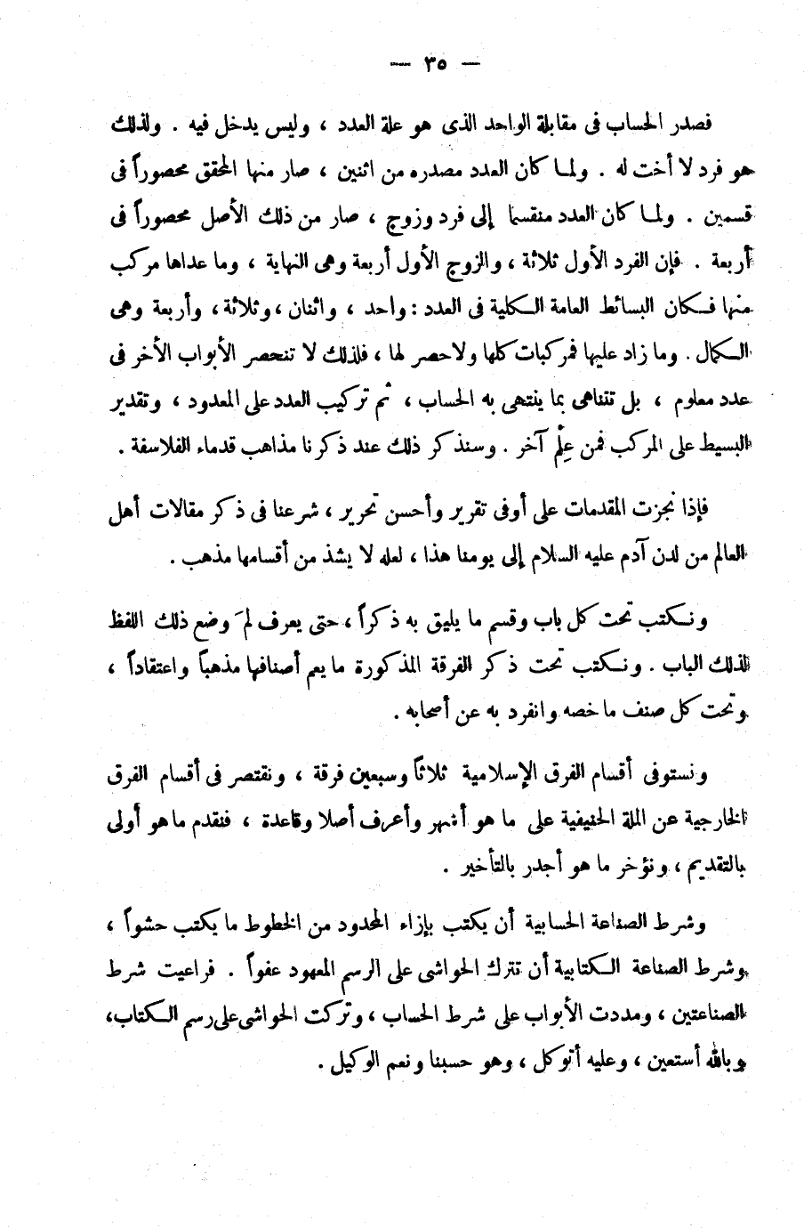 وشرط الصناعة الحسابية أن يكتب بإزاء المحدود من الخطوط ما يكتب حشوا، وشرط الصناعة الكتابية أن تترك الحواشي على الرسم المعهود عفوا. فراعيت شرط الصناعتين، ومددت الأبواب على شرط الحساب، وتركت الحواشي على رسم الكتاب، وبالله أستعين، وعليه أتوكل، وهو حسبنا ونعم الوكيل.