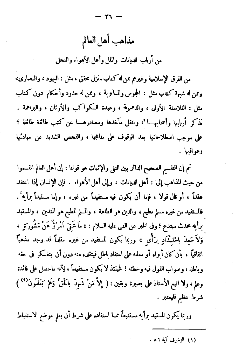 ثم إن التقسيم الصحيح الدائر بين النفي والإثبات هو قولنا: إن أهل العالم انقسموا من حيث المذاهب إلى: أهل الديانات، وإلى أهل الأهواء. فإن الإنسان إذا اعتقد عقدا، أو قال قولا، فإما أن يكون فيه مستفيدا من غيره، وإما مستبدا برايه. فالمستفيد من غيره مسلم مطيع، والدين هو الطاعة، والمسلم المطيع هو المتدين، والمستبد برأيه محدث مبتدع؛ وفي الخبر عن النبي عليه السلام: "ما شقي امرؤ عن مشورة، ولا سعد باستبداد برأي" وربما يكون المستفيد من غيره مقلدا قد وجد مذهبا اتفاقيا، بأن كان أبواه أو معلمه على اعتقاد باطل فيتقلده منه دون أن يتفكر في حقه وباطله، وصواب القول فيه وخطئه؛ فحينئذ لا يكون مستفيدا، لأنه ما حصل على فائدة وعلم، ولا اتبع الأستاذ على بصيرة ويقين: {إِلَّا مَنْ شَهِدَ بِالْحَقِّ وَهُمْ يَعْلَمُونَ} 1 شرط عظيم فليعتبر.