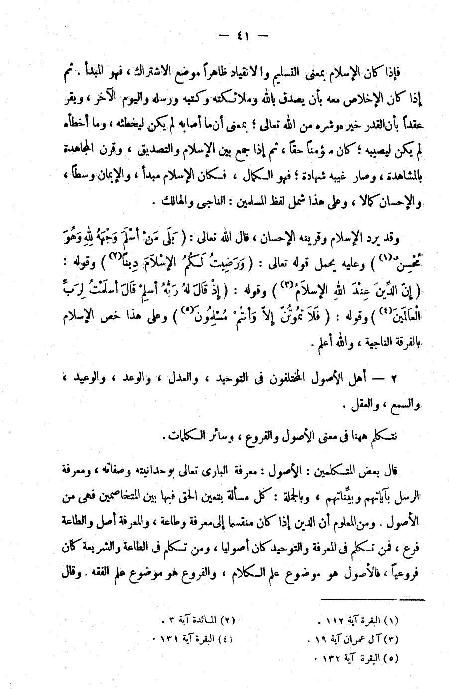 وقد يرد الإسلام وقرينه الإحسان، قال الله تعالى: {بَلَى مَنْ أَسْلَمَ وَجْهَهُ لِلَّهِ وَهُوَ مُحْسِنٌ} 1 وعليه يحمل قوله تعالى: {وَرَضِيتُ لَكُمُ الْأِسْلامَ دِينًا} 2 وقوله: {إِنَّ الدِّينَ عِنْدَ اللَّهِ الْأِسْلامُ} 3 وقوله: {إِذْ قَالَ لَهُ رَبُّهُ أَسْلِمْ قَالَ أَسْلَمْتُ لِرَبِّ الْعَالَمِين} 4 وقوله: {فَلا تَمُوتُنَّ إِلَّا وَأَنْتُمْ مُسْلِمُونَ} 5 وعلى هذا خص الإسلام بالفرقة الناجية، والله أعلم.