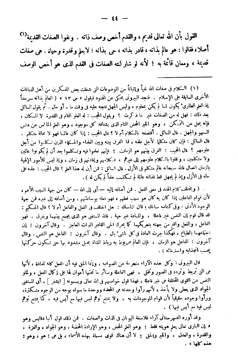 القول بأن الله تعالى قديم، والقدم أخص وصف ذاته. ونفوا الصفات القديمة1 أصلا، فقالوا: هو عالم بذاته، قادر بذاته، حي بذاته؛ لا بعلم وقدرة وحياة. هي صفات قديمة، ومعان قائمة به؛ لأنه لو شاركته الصفات في القدم الذي هو أخص الوصف