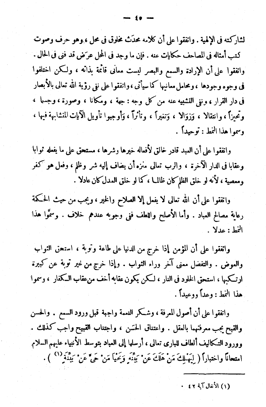 لشاركته في الإلهية. واتفقوا على أن كلام محدث مخلوق في محل، وهو حرف وصوت كتب أمثاله في المصاحف حكايات عنه. فإن ما وجد في المحل عرض قد فني في الحال. واتفقوا على أن الإرادة والسمع والبصر ليست معاني قائمة بذاته، ولكن اختلفوا في وجوه وجودها، ومحامل معانيها كما سيأتي، واتفقوا على نفي رؤية الله تعالى بالأبصار في دار القرار، ونفي التشبيه عنه من كل وجه: جهة، ومكانا، وصورة، وجسما، وتحيزا، وانتقالا، وزوالا، وتغيرا، وتأثرا، وأوجبوا تأويل الآيات المتشابة فيها، وسموا هذا النمط: توحيدا.