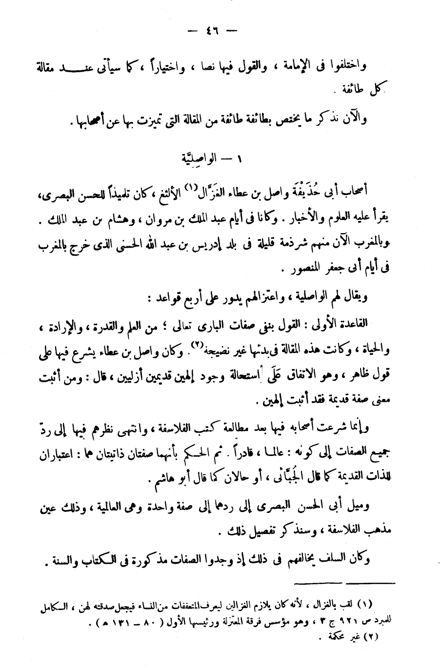 اصحاب أبي حذيفة واصل بن عطاء الغزال1 الألثغ، كان تلميذا للحسن البصري، يقرأ عليه العلوم والأخبار. وكانا في أيام عبد الملك بن مروان، وهشام بن عبد الملك. وبالمغرب الآن منهم شرذمة قليلة في بلد إدريس بن عبد الله الحسني الذي خرج بالمغرب في أيام أبي جعفر المنصور.