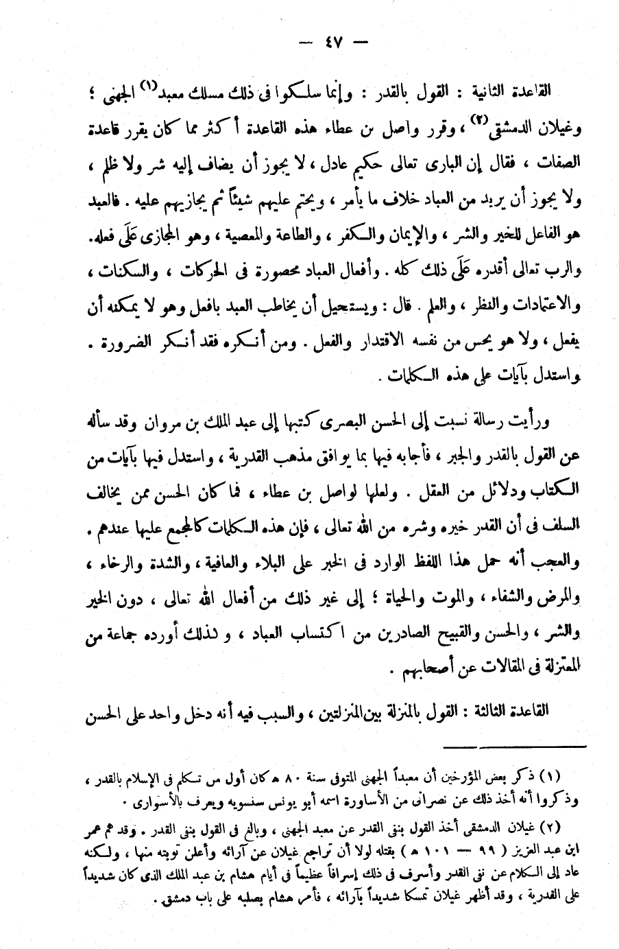 2 غيلان الدمشقي أخذ القول بنفي القدر عن معبد الجهني، وبالغ في القول بنفي القدر. وقد هم عمر بن عبد العزيز "99-101هـ" بقتله لولا أن تراجع غيلان عن آرائه وأعلن توبته منها، ولكنه عاد إلى الكلام عن نفي القدر وأسرف في ذلك إسرافا عظيما في أيام هشام بن عبد الملك الذي كان شديدا على القدرية، وقد أظهر غيلان تمسكا شديدا بآرائه، فأمر هشام بصلبه على باب دمشق.