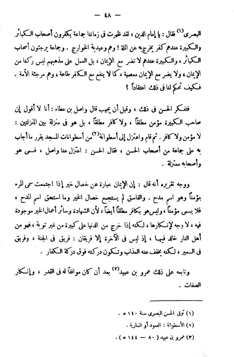فتفكر الحسن في ذلك، وقبل أن يجيب قال واصل بن عطاء: أنا لا أقول إن صاحب الكبيرة مؤمن مطلقا، ولا كافر مطلقا، بل هو في منزلة بين المنزلتين: لا مؤمن ولا كافر. ثم قام واعتزل إلى أسطوانة2 من أسطوانات المسجد يقرر ما أجاب به على جماعة من أصحاب الحسن، فقال الحسن: اعتزل عنا واصل، فسمي هو وأصحابه معتزلة.