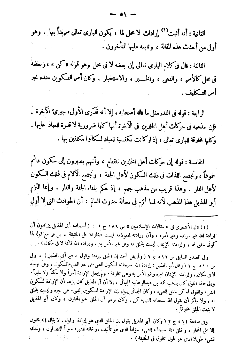 وفي المصدر السابق ص512 ج2 "ولم يقل أحد إن الخلق إرادة وقول، غير أبي الهذيل"، وفي ص510 ج1 "وقال أبو الهذيل: إرادة الله سبحانه لكون الشيء هي غير الشيء المكون، وهي توجد لا في مكان، وإرادته للإيمان غيره وغير الأمر به وهي مخلوقة، ولم يجعل الإرادة أمرا ولا حكما ولا خبرا. وإلى هذا القول كان يذهب محمد بن عبد الوهاب الجبائي، إلا أن أبا الهذيل كان يزعم أن الإرادة لتكوين الشيء والقول له كن خلق للشيء. وكان الجبائي يقول إن الإرادة لتكوين الشيء هي غيره وليست بخلق له، ولا جائز أن يقول الله سبحانه للشيء كن. وكان يزعم أن الخلق هو المخلوق، وكان أبو الهذيل لا يثبت الخلق مخلوقا.
