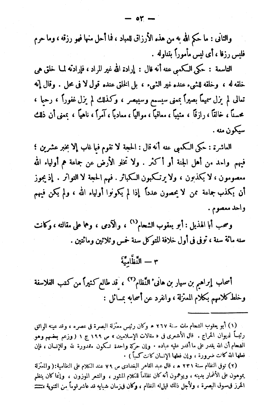 1 توفي النظام سنة 231هـ، قال عبد القاهر البغدادي ص79 عند الكلام على النظامية: "والمعتزلة يموهون على الأغمار بدينه، ويوهمون أنه كان نظاما للكلام المنثور، والشعر الموزون، وإنما كان ينظم الخرز في سوق البصرة، ولأجل ذلك قيل له النظام، وكان في زمان شبابه قد عاشر قوما من الثنوية، وقوما من السمنية القائلين بتكافؤ الأدلة، وخالط بعد كبره قوما من ملحدة الفلاسفة، ثم خالط هشام بن الحكم الرافضي، فأخذ عن هشام، وعن ملحدة الفلاسفة قوله بإبطال الجزء الذي لا يتجزأ، ثم بنى عليه قوله بالطفرة التي لم يسبق إليها وهم أحد قبله، وأخذ من الثنوية قوله بأن فاعل العدل لا يقدر على فعل الجور والكذب، وأخذ عن هشام بن الحطم أيضا قوله: بأن الألوان، والطعوم، والروائح، والأصوات أجسام، وبنى على هذه البدعة قوله بتداخل الأجسام".