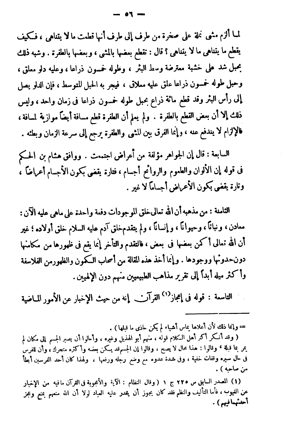 لما ألزم مشي نملة على صخرة من طرف إلى طرف أنها قطعت ما لا يتناهى، فكيف يقطع ما يتناهى ما لا يتناهى؟ قال: تقطع بعضها بالمشي، وبعضها بالطفرة. وشبه ذلك بحبل شد على خشبة معترضة وسط البئر، وطوله خمسون ذراعا، وعليه دلو معلق، وحبل طوله خمسون ذراعا علق عليه معلاق, فيجر به الحبل المتوسط، فإن الدلو يصل إلى رأس البئر وقد قطع مائة ذراع بحبل طوله خمسون ذراعا في زمان واحد، وليس ذلك إلا أن بعض القطع بالطفرة. ولم يعلم أن الطفرة قطع مسافة أيضا موازية لمسافة، فالإلزام لا يندفع عنه، وإنما الفرق بين المشي والطفرة يرجع إلى سرعة الزمان وبطئه.