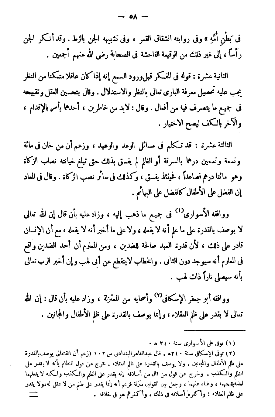 2 توفي الإسكافي سنة 240هـ. قال عبد القاهر البغدادي ص102 "زعم أن الله تعالى يوصف بالقدرة على ظلم الأطفال والمجانين. ولا يوصف بالقدرة على ظلم العقلاء. فخرج عن قول النظام بأنه لا يقدر على الظلم والكذب. وخرج عن قول من قال من أسلافه إنه يقدر على الظلم والكذب ولكنه لا يفعلهما لعلمه بقبحهما، وغناه عنهما، وجعل بين القولين منزلة فزعم أنه إنما يقدر على ظلم من لا عقل له، ولا يقدر على ظلم العقلاء: وأكفره أسلافه في ذلك، وأكفرهم هو في خلافه. =