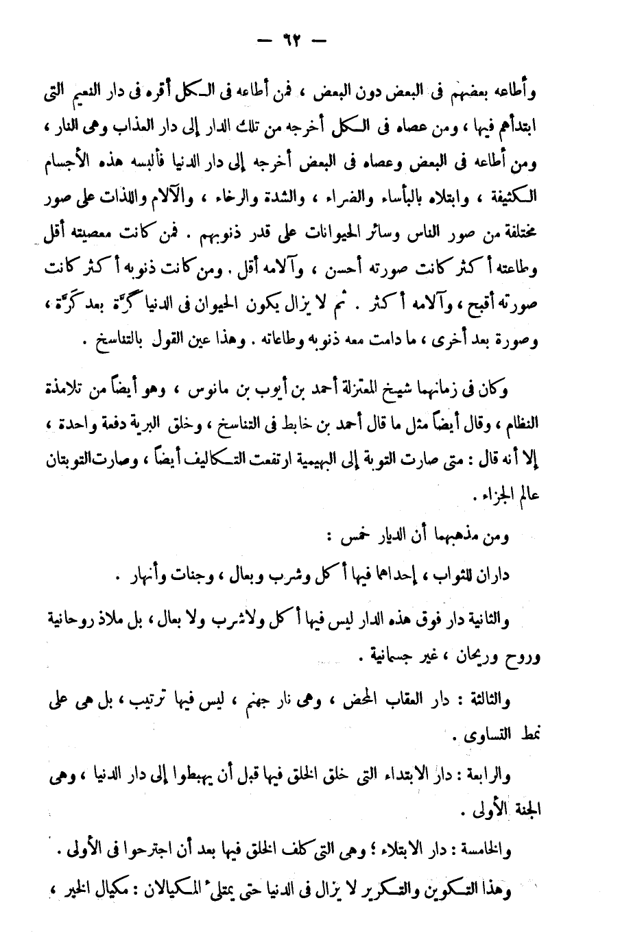 وأطاعه بعضهم في البعض دون البعض، فمن أطاعه في الكل أقره في دار النعيم التي ابتدأهم فيها، ومن عصاه في الكل أخرجه من تلك الدار إلى دار العذاب وهي النار، ومن أطاعه في البعض وعصاه في البعض أخرجه إلى دار الدنيا فألبسه هذه الأجسام الكثيفة، وابتلاه بالبأساء والضراء، والشدة والرخاء، والآلام واللذات على صر مختلفة من صور الناس وسائر الحيوانات على قدر ذنوبهم. فمن كانت معصيته أقل وطاعته أكثر كانت صورته أحسن، وآلامه أقل. ومن كانت ذنوبه أكثر كانت صورته أقبح، وآلامه أكثر. ثم لا يزال يكون الحيوان في الدنيا كرة بعد كرة، وصورة بعد أخرى، مادات معه ذنوبه وطاعاته. وهذا عين القول بالتناسخ.