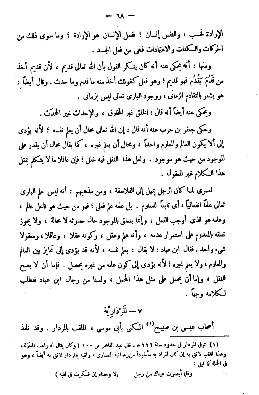 1 توفي المردار في حدود سنة 226هـ، قال عبد القاهر ص100 "وكان يقال له راهب المعتزلة، وهذا اللقب لائق به إن كان المراد به مأخوذا من رهبانية النصار، ولقبه بالمردار لائق به أيضا، وهو في الجملة كما قيل: