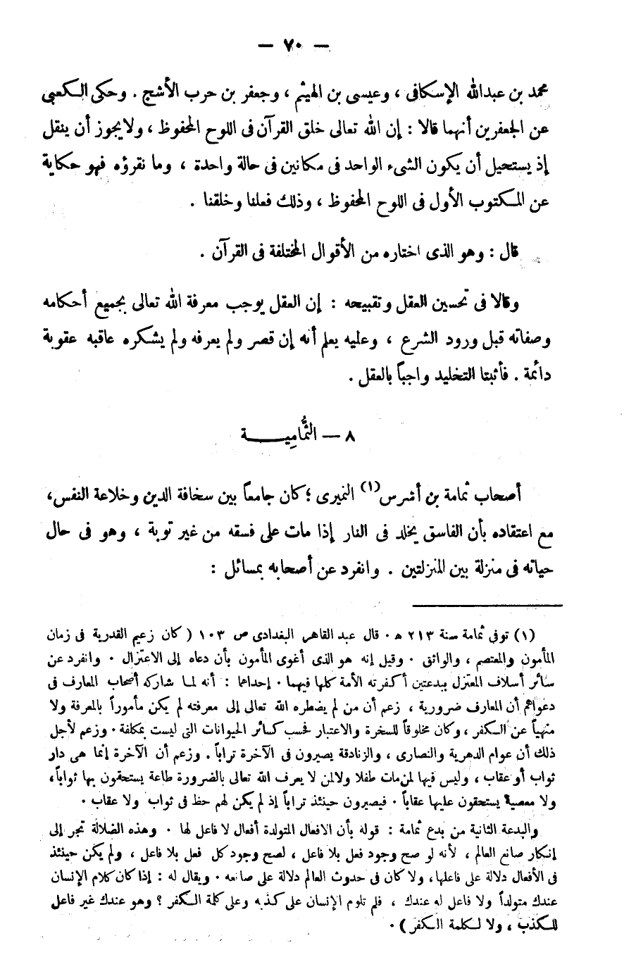 1 توفي ثمامة سنة 213هـ. قال عبد القاهر البغدادي ص103 "كان زعيم القدرية في زمان المأمون والمعتصم، والواثق، وقيل إنه هو الذي أغوى المأمون بأن دعاه إلى الاعتزال. وانفرد عن سائر أسلاف المعتزل ببدعتين أكفرته الأمة كلها فيهما. إحداهما: أنه لما شاركه أصحاب المعارف في دعواهم أن المعارف ضرورية، زعم أن من لم يضطره الله تعالى إلى معرفته لم يكن مأمورا بالمعرفة ولا منهيا عن الكفر، وكان مخلوقا للسخرة والاعتبار فحسب كسائر الحيوانات التي ليست بمكلفة وزعم لأجل ذلك أن عوام الدهرية والنصارى، والزنادقة يصيرون في الآخرة ترابا. وزعم أن الآخرة إنما هي دار ثواب أو عقاب، وليس فيها لمن مات طفلا ولا لمن لا يعرف الله تعالى بالضرورة طاعة يستحقون بها ثوابا" ولا معصية يستحقون عليها عقابا. فيصيرون حينئذ ترابا إذ لم يكن لهم حظ في ثواب، ولا عقاب.