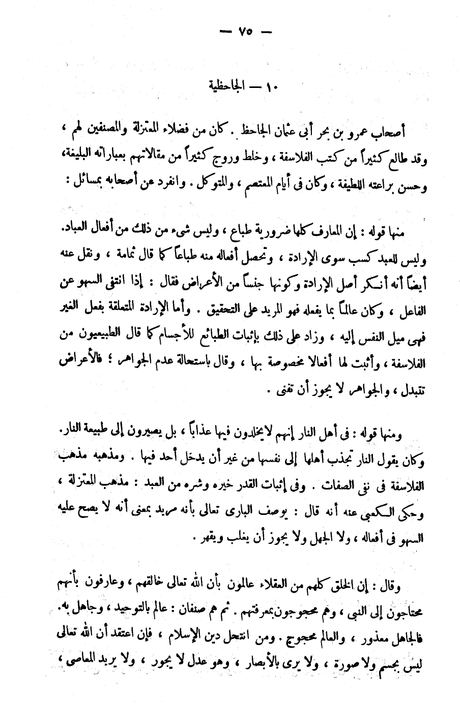 وقال: إن الخلق كلهم من العقلاء عالمون بأن الله تعالى خالقهم، وعارفون بأنهم محتاجون إلى النبي، وهم محجوجون بمعرفتهم. ثم هم صنفان: عالم بالتوحيد، وجاهل به. فالجاهل معذور، والعالم محجوج. ومن انتحل دين الإسلام، فإن اعتقد أن الله تعالى ليس بجسم ولا صورة، ولا يرى بالإبصار، وهو عدل لا يجور، ويريد المعاصي،