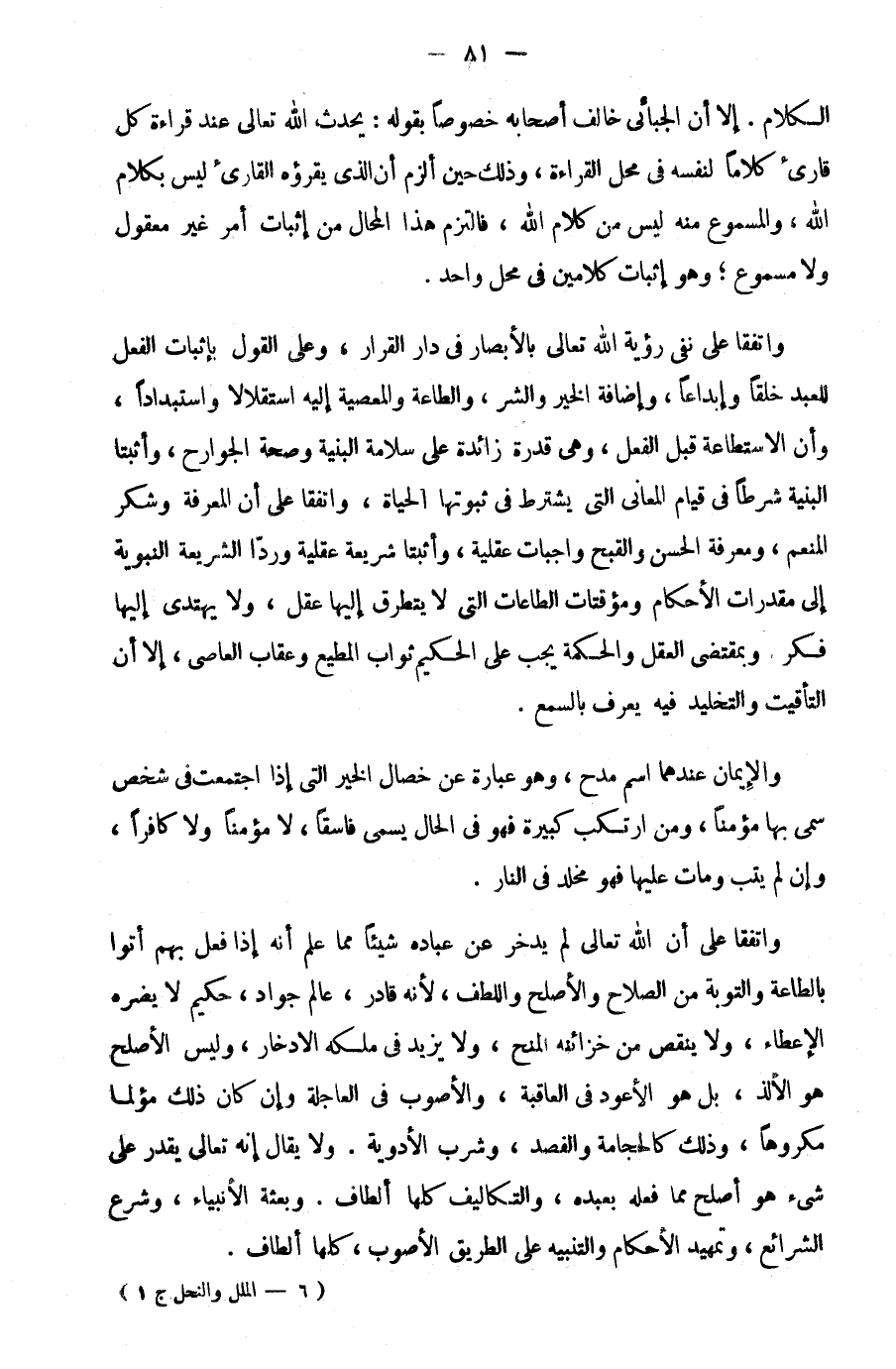 واتفقا على نفي رؤية الله تعالى بالأبصار في دار القرار، وعلى القول بإثبات الفعل للعبد خلقا وإبداعا، وإضافة الخير والشر، والطاعة والمعصية إليه استقلالا واستبدادا، وأن الاستطاعة قبل الفعل، وهي قدرة زائدة على سلامة البنية وصحة الجوارح، وأثبتا البنية شرطا في قيام المعاني التي يشترط في ثبوتها الحياة، واتفقا على أن المعرفة وشكر المنعم، ومعرفة الحسن والقبح واجبات عقلية، وأثبتا شريعة عقلية وردا الشريعة النبوية إلى مقدرات الأحكام ومؤقتات الطاعات التي لا يتطرق إليها عقل، ولا يهتدي إليها فكر. وبمقتضى العقل والحكم يجب على الحكيم ثواب المطيع وعقاب العاصي، إلا أن التأقيت والتخليد فيه يعرف بالسمع.