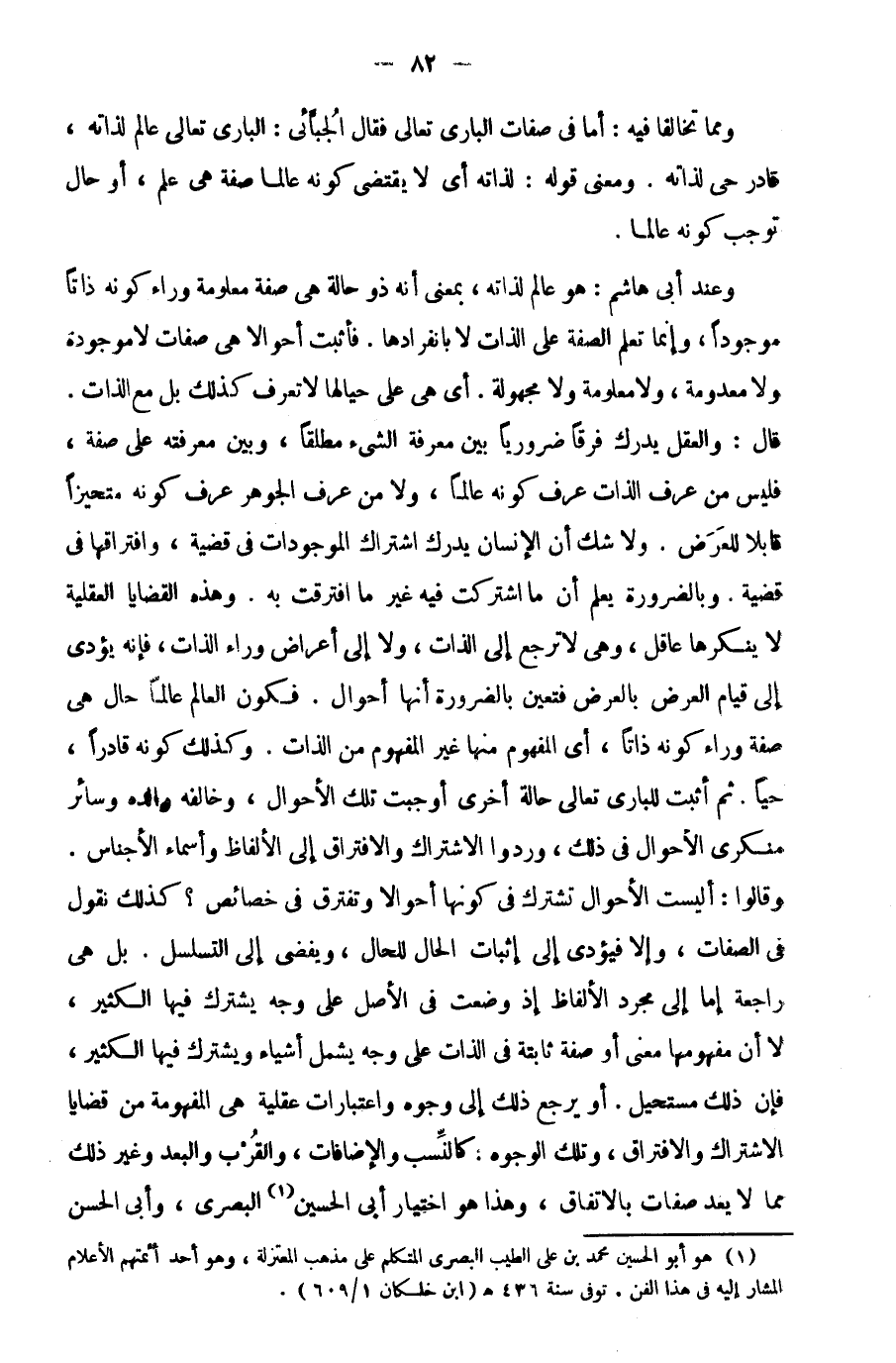 وعند أبي هاشم: هو عالم لذاته، بمعنى أنه ذو حالة هي صفة معلومة وراء كونه ذاتا موجودا، وإنما تعلم الصفة على الذات لا بانفرادها. فأثبت أحوالا هي صفات لا موجودة ولا معدومة ولا معلومة ولا مجهولة. أي هي على حيالها لا تعرف كذلك بل مع الذات. قال: والعقل يدرك فرقا ضروريا بين معرفة الشيء مطلقا، وبين معرفته على صفة، فليس من عرف الذات عرف كونه عالما، ولا من عرف الجوهر عرف كونه متحيزا قابلا للعرض. ولا شك أن الإنسان يدرك اشتراك الموجودات في قضية، وافتراقها في قضية. وبالضرورة يعلم أن ما اشتركت فيه غير ما افترقت به. وهذه القضايا العقلية لا ينكرها عاقل، وهي لا ترجع إلى الذات، ولا إلى أعراض وراء الذات، فإنه يؤدي إلى قيام العرض بالعرض فتعين بالضرورة أنها أحوال. فكون العالم عالما حال هي صفة وراء كونه ذاتا، أي المفهوم منها غير المفهوم من الذات. وكذلك كونه قادرا، حيا. ثم أثبت للباري تعالى حالة أخرى أوجبت تلك الأحوال، وخالفه والده وسائر منكري الأحوال في ذلك، وردوا الاشتراك والافتراق إلى الألفاظ وأسماء الأجناس. وقالوا: أليست الأحوال تشترك في كونها أحوالا وتفترق في خصائص؟ كذلك نقول في الصفات، وإلا فيؤدي إلى إثبات الحال للحال، ويفضي إلى التسلسل. بل هي راجعة إما إلى مجرد الألفاظ إذ وضعت في الأصل على وجه يشترك فيها الكثير، لا أن مفهومها معنى أو صفة ثابتة في الذات على وجه يشمل أشياء ويشترك فيها الكثير، فإن ذلك مستحيل. أو يرجع ذلك إلى وجوه واعتبارات عقلية هي المفهومة من قضايا الاشتراك والافتراق، وتلك الوجوه. كالنسب والإضافات، والقرب والبعد وغير ذلك مما لا يعد صفات بالاتفاق، وهذا هو اختيار أبي الحسين1 البصري، وأبي الحسن