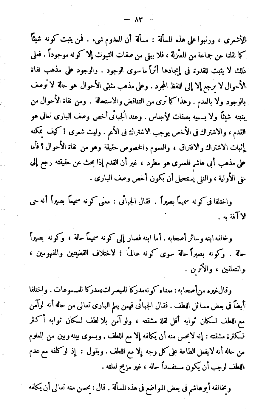 الأشعري، ورتبوا على هذه المسألة: مسألة أن المعدوم شيء. فمن يثبت كونه شيئا كما نقلنا عن جماعة من المعتزلة، فلا يبقى من صفات الثبوت إلا كونه موجودا. فعلى ذلك لا يثبت للقدرة في إيجادها أثرا ما سوى الوجود. والوجود على مذهب نفاة الأحوال لا يرجع إلا إلى اللفظ المجرد. وعلى مذهب مثبتي الأحوال هو حالة لا توصف بالوجود ولا بالعدم. وهذا كما ترى من التناقض والاستحالة. ومن نفاة الأحوال من يثبته شيئا ولا يسميه بصفات الأجناس. وعند الجبائي أخص وصف الباري تعالى هو القدم، والاشتراك في الأخص يوجب الاشتراك في الأعم. وليت شعري! كيف يمكنه إثبات الاشتراك والافتراق، والعموم والخصوص حقيقة وهو من نفاة الأحوال؟ فأما على مذهب أبي هاشم فلعمري هو مطرد، غير أن القدم إذا بحث عن حقيقته رجع إلى نفي الأولية، والنفي يستحيل أن يكون أخص وصف الباري.