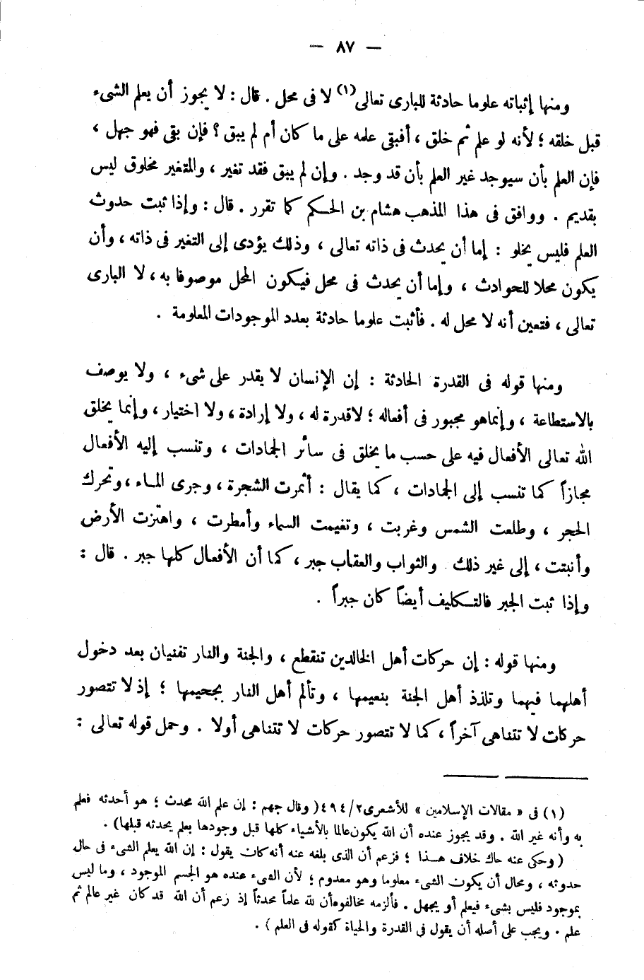 1 في "مقالات الإسلاميين" للأشعري 2/ 494 "وقال جهم: إن علم الله محدث؛ هو أحدثه فعلم به وأنه غير الله. وقد يجوز عنده أن الله يكون عالما بالأشياء كلها قبل وجودها بعلم يحدثه قبلها".