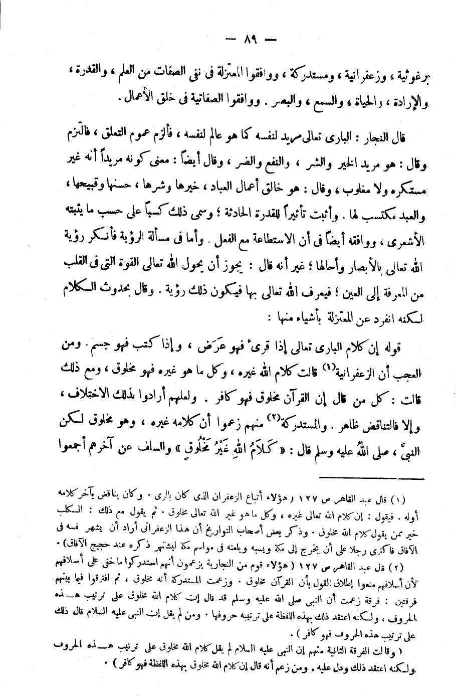 2 قال عبد القاهر ص127 "هؤلاء قوم من النجارية يزعمون أنهم استدركوات ما خفي على أسلافهم لأن أسلافهم منعوا إطلاق القول بأن القرآن مخلوق. وزعمت المستدركة أنه مخلوق، ثم افترقوا فيما بينهم فرقتين: فرقة زعمت أن النبي صلى الله عليه وسلم قد قال إن كلام الله مخلوق على ترتيب هذه الحروف، ولكنه اعتقد ذلك بهذه اللفظة على ترتيبه حروفها. ومن لم يقل إن النبي عليه السلام قال ذلك على ترتيب هذه الحروف فهو كافر".