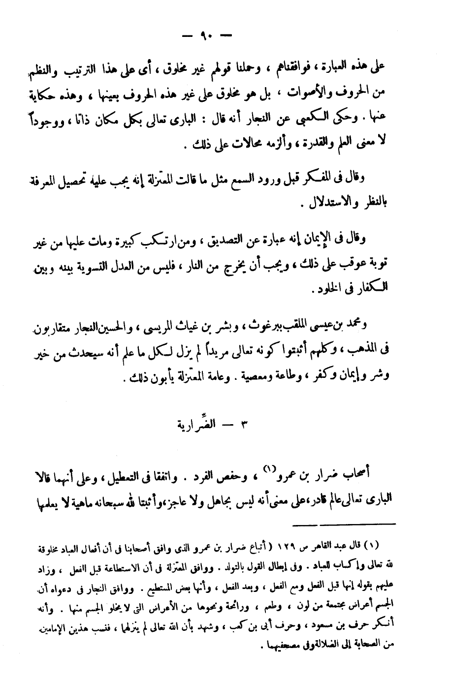 1 قال عبد القاهر ص129 "أتابع ضرار بن عمرو الذي وافق أصحابنا في أن أفعال العباد مخلوقة لله تعالى وإكساب للعباد. وفي إبطال القول بالتولد. ووافق المعتزلة في أن الاستطاعة قبل الفعل، وزاد عليهم بقوله إنها قبل الفعل ومع الفعل، وبعد الفعل، وأنها بعض المستطيع. ووافق النجار في دعواه أن الجسم أعراض مجتمعة من لون، وطعم، ورائحة ونحوها من الأعراض التي لا يخلو الجسم منها. وأنه أنكر حرف بن مسعود، وحرف أبي بن كعب، وشهد بأن الله تعالى لم ينزلهما، فنسب هذين الإمامين من الصحابة إلى الضلالة وفي مصحفيهما.