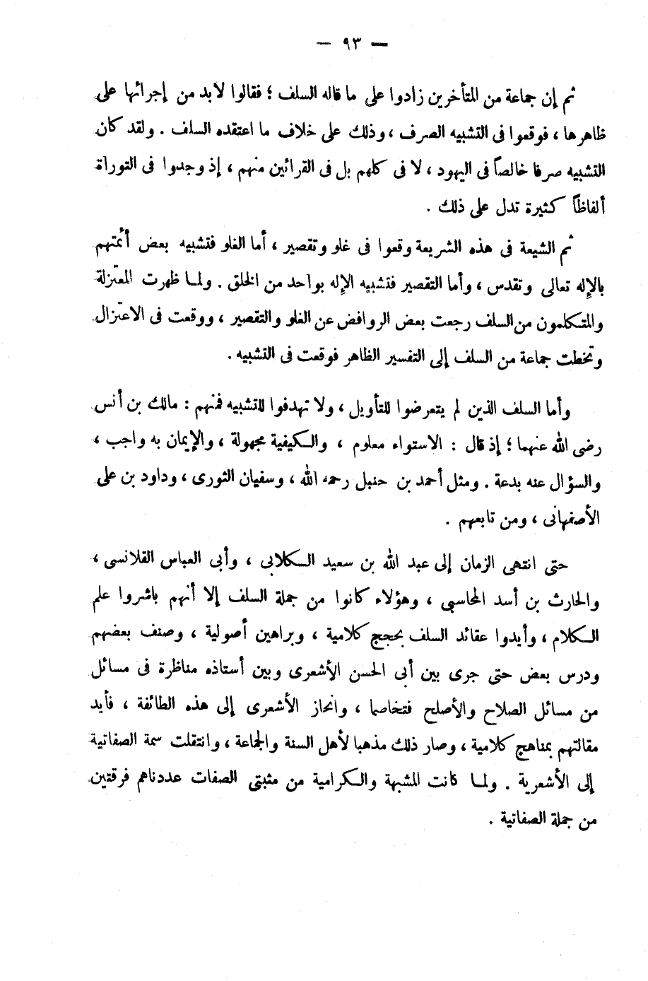 ثم إن جماعة من المتأخرين زادوا على ما قاله السلف؛ فقالوا لابد من إجرائها على ظاهرها، فوقعوا في التشبيه الصرف، وذلك على خلاف ما اعتقده السلف. ولقد كان التشبيه صرفا خالصا في اليهود، لا في كلهم بل في القرائين منهم، إذ وجدوا في التوراة ألفاظا كثيرة تدل على ذلك.