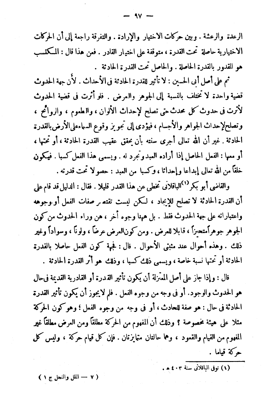 قال: وإذا جاز على أصل المعتزلة أن يكون تأثير القدرة أو القادرية القديمة في حال هو الحدوث والوجود. أو في وجه من وجوه الفعل. فلم لا يجوز أن يكون تأثير القدرة الحادثة في حال: هو صفة للحادث، أو في وجه من وجوه الفعل؛ وهو كون الحركة مثلا على هيئة مخصوصة؟ وذلك أن المفهوم من الحركة مطلقا ومن العرض مطلقا غير المفهوم من القيام والقعود، وهما حالتان متمايزتان. فإن كل قيام حركة، وليس كل حركة قياما.