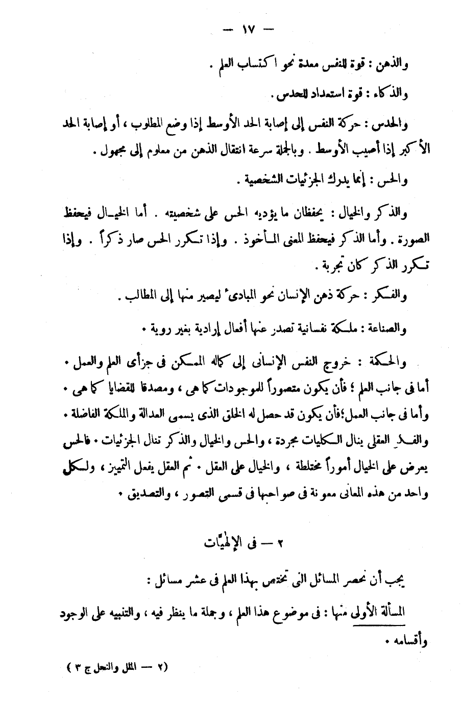 والحكمة: خروج النفس الإنساني إلى كماله الممكن في جزأي العلم والعمل. أما في جانب العلم, فأن يكون متصورا للموجودات كما هي ومصدقا للقضايا كما هي، وأما في جانب العمل, فأن يكون قد حصل له الخلق الذي يسمى العدالة والملكة الفاضلة. والفكر العقلي ينال الكليات مجردة، والحس والخيال والذكرتنال الجزئيات. فالحس يعرض على الخيال أمورا مختلطة، والخيال على العقل، ثم العقل يفعل التمييز. ولكل واحد من هذه المعاني معونة في صواحبها في قسمي التصور والتصديق.