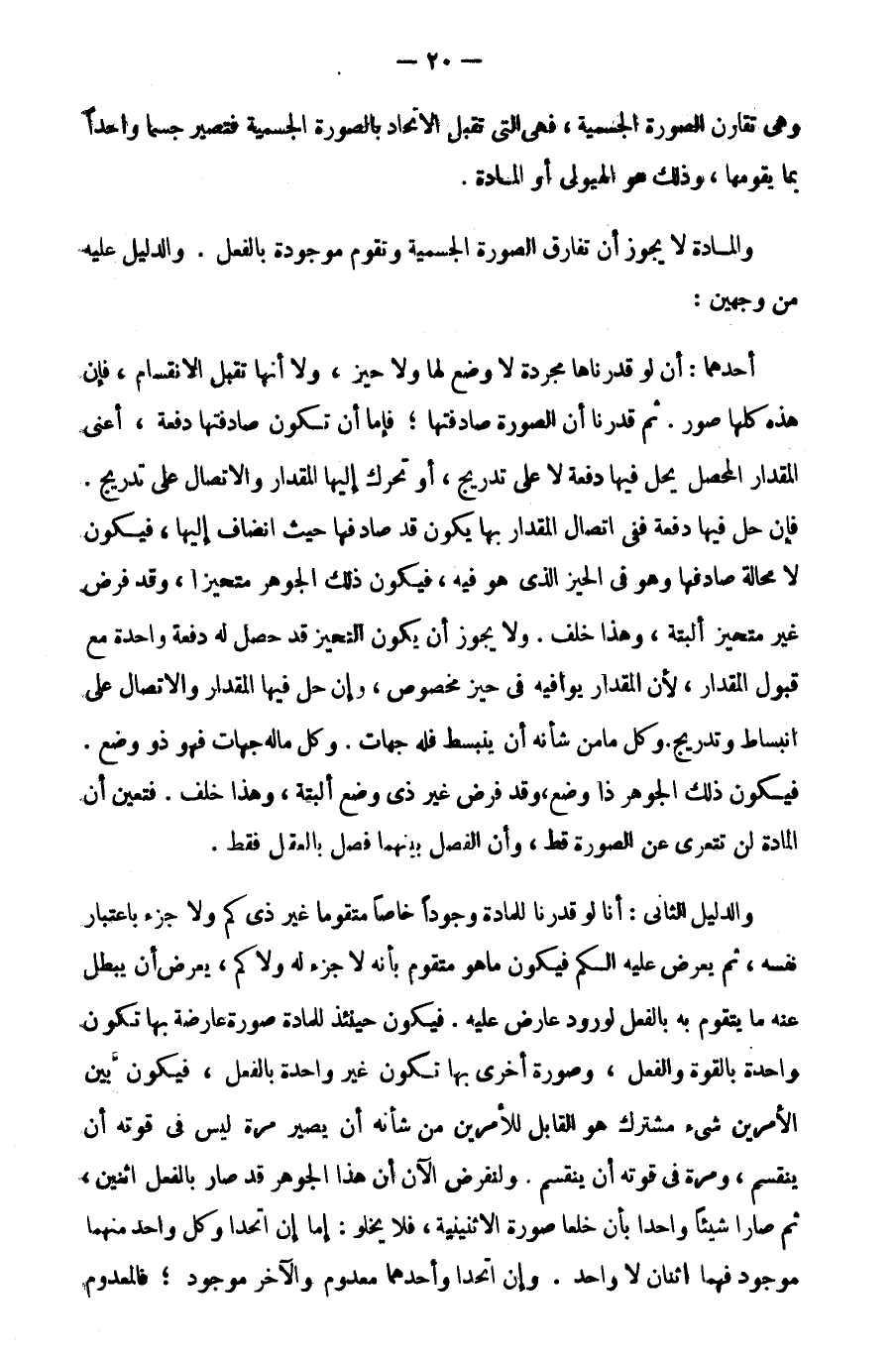 والدليل الثاني: أنا لو قدرنا للمادة وجودا خاصا متقوما غير ذي كم ولا جزء باعتبار نفسه، ثم يعرض عليه الكم فيكون ما هو متقوم بأنه لا جزء له ولا كم, يعرض أن يبطل عنه ما يتقوم به بالفعل لورود عارض عليه، فيكون حينئذ للمادة صورة عارضة بها تكون واحدة بالقوة والفعل، وصورة أخرى بها تكون غير واحدة بالفعل، فيكون بين الأمرين شيء مشترك هو القابل للأمرين من شأنه أن يصير مرة ليس في قوته أن ينقسم، ومرة في قوته أن ينقسم. ولنفرض الآن أن هذا الجوهر قد صار بالفعل أثنين، ثم صارا شيئا واحدا بأن خلعا صورة الأثنينية، فلا يخلو: أما إن اتحدا وكل واحد منهما موجود فهما اثنان لا واحد، وإن اتحدا وأحدهما معدوم والآخر موجود؛ فالمعدوم
