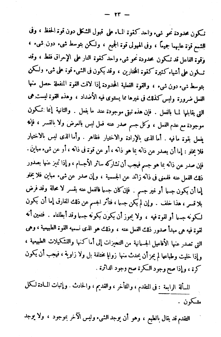 تكون محدودة نحو شيء واحد كقوة الماء على قبول الشكل دون قوة الحفظ، وفي الشمع قوة عليهما جميعا، وفي الهيولى قوة الجميع, ولكن بتوسط شيء دون شيء، وقوة الفاعل قد تكون محدودة نحو شيء واحد، كقوة النار على الإحراق فقط، وقد تكون على أشياء كثيرة كقوة المختارين، وقد يكون في الشيء قوة على شيء ولكن بتوسط شيء دون شيء، والقوة الفعلية المحدودة إذا لاقت القوة المنفعلة حصل منها الفعل ضرورة، وليس كذلك في غيرها مما يستوي فيه الأضداد، وهذه القوة ليست هي التي يقابلها لما بالفعل، فإن هذه تبقى موجودة عندما يفعل، والثانية إنما تكون موجودة مع عدم الفعل. وكل جسم صدر عنه فعل ليس بالعرض ولا بالقسر, فإنه يفعل بقوة ما فيه، أما الذي بالإرادة والاختيار فظاهر، وأما الذي ليس بالاختيار فلا يخلو: إما أن يصدر عن ذاته بما هو ذاته، أو عن قوة في ذاته، أو عن شيء مباين، فإن صدر عن ذاته بما هو جسم فيجب أن تشاركه سائر الأجسام، وإذا تميز عنها بصدور ذلك الفعل عنه فلمعنى في ذاته زائد على الجسمية، وإن صدر عن شيء مباين فلا يخلو إما أن يكون جسما أو غير جسم، فإن كان جسما فالفعل عنه بقسر لا محالة وقد فرض بلا قسر، هذا خلف. وإن لم يكن جسما، فتأثر الجسم عن ذلك المفارق إما أن يكون لكونه جسما أو لقوة فيه، ولا يجوز أن يكون بكونه جسما وقد أبطلناه، فتعين أنه لقوة فيه هي مبدأ صدور ذلك الفعل عنه وذلك هو الذي نسميه القوة الطبيعية، وهي التي تصدر عنها الأفاعيل الجسمانية من التحيزات إلى أماكنها والتشكيلات الطبيعية، وإذا خليت وطباعها لم يجز أن يحدث منها زوايا مختلفة بل ولا زاوية, فيجب أن تكون كرة، وإذا صح وجود الكرة صح وجود الدائرة.
