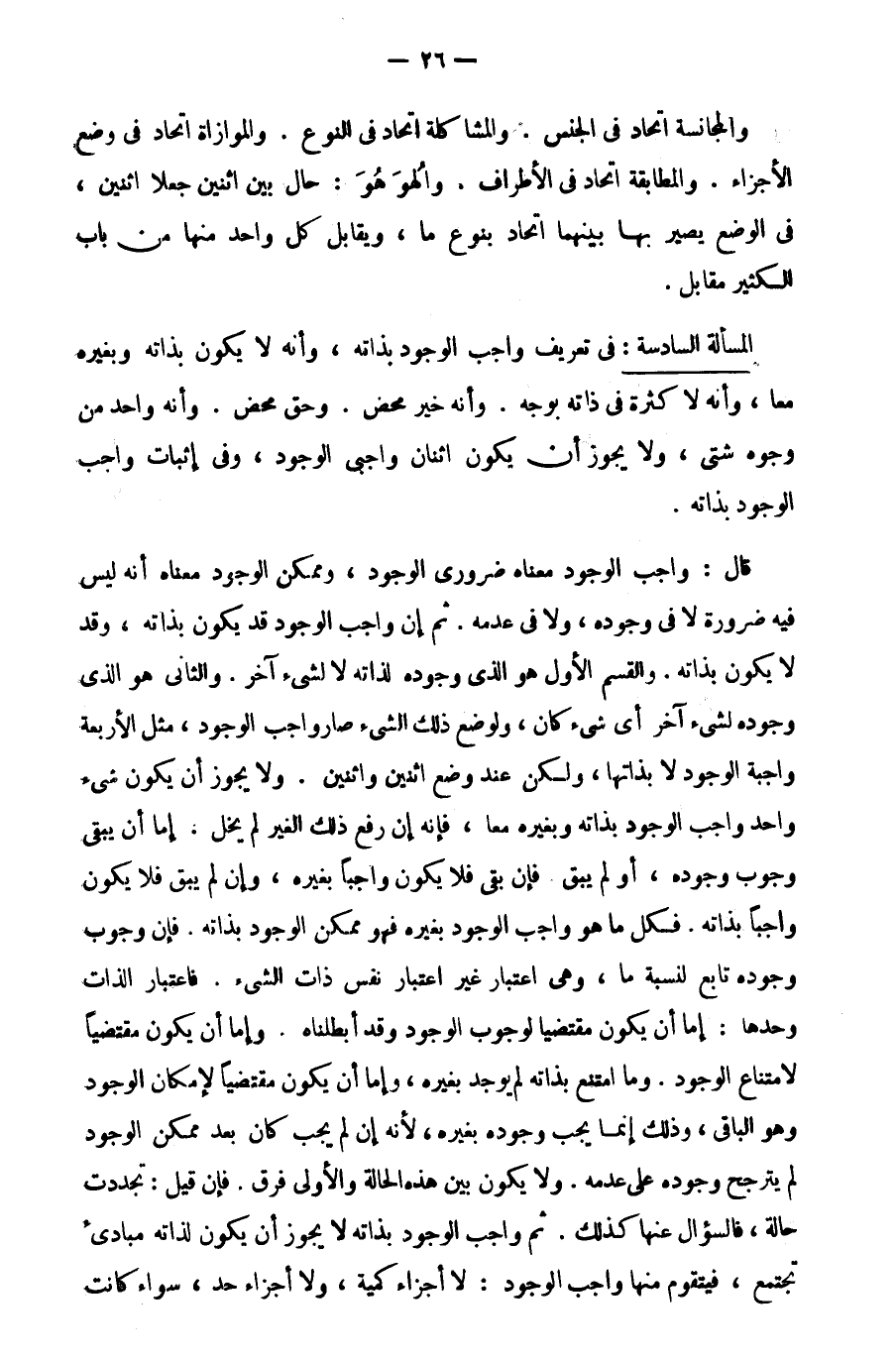 في تعريف واجب الوجود بذاته، وأنه لا يكون بذاته وبغيره معا، وأنه لا كثرة في ذاته بوجه، وأنه خير محض. وحق محض. وأنه واحد من وجوه شتى, ولا يجوز أن يكون اثنان واجبي الوجود, وفي إثبات واجب الوجود بذاته.