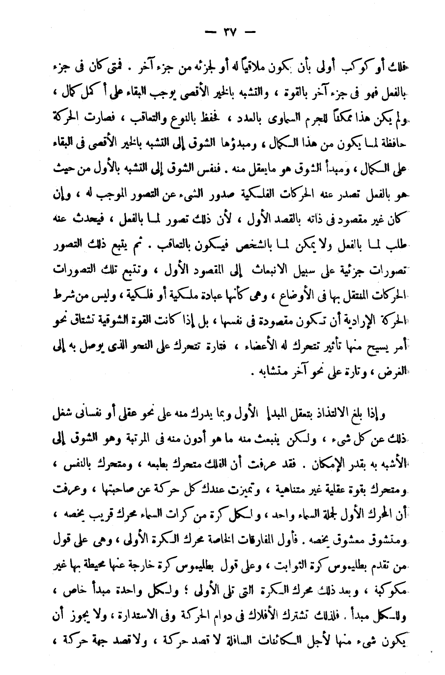 فلك أو كوكب أولي بأن يكون ملاقيا له أو لجزئه من جزء آخر. فمتى كان في جزء بالفعل فهو في جزء آخر بالقوة, والتشبه بالخير الأقصى يوجب البقاء على أكمل كمال، ولم يكن هذا ممكنا للجرم السماوي بالعدد، فحفظ بالنوع والتعاقب، فصارت الحركة حافظة لما يكون من هذا الكمال، ومبدؤها الشوق إلى التشبه بالخير الأقصى في البقاء على الكمال، ومبدأ الشوق هو ما يعقل منه. فنفس الشوق إلى التشبه بالأول من حيث هو بالفعل تصدر عنه الحركات الفلكية صدور الشيء عن التصور المرجب له، وإن كان غير مقصود في ذاته بالقصد الأول، لأن ذلك تصور لما بالفعل، فيحدث عنه طلب لما بالفعل ولا يمكن لما بالشخص فيكون بالتعاقب، ثم يتبع ذلك التصور تصورات جزئية على سبيل الانبعاث إلى المقصود الأول، وتتبع تلك التصورات الحركات المنتقل بها في الأوضاع، وهي كأنها عبادة ملكية أو فلكية, وليس من شرط الحركة الإرادية أن تكون مقصودة في نفسها، بل إذا كانت القوة الشوقية تشتاق نحو أمر يسيح منها تأثير تتحرك له الأعضاء، فتارة تتحرك على النحو الذي يوصل به إلى الغرض، وتارة على نحو آخر متشابه.