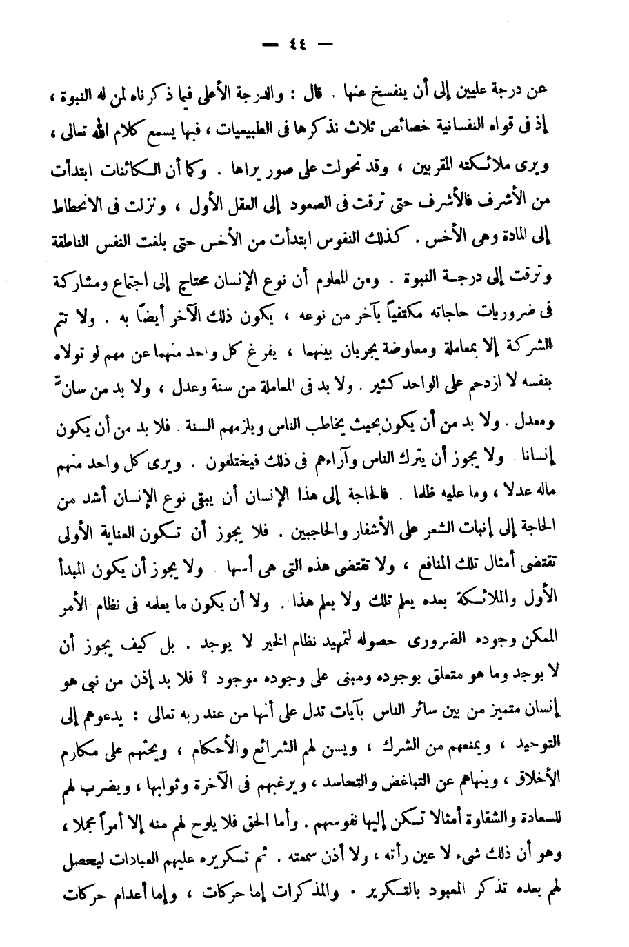 عن درجة عليين إلى أن ينفسخ عنها. قال: والدرجة الأعلى فيما ذكرناه لمن له النبوة، إذ في قواه النفسانية خصائص ثلاث نذكرها في الطبيعيات فبها يسمع كلام الله تعالى، ويرى ملائكته المقربين، وقد تحولت على صور يراها. وكما أن الكائنات ابتدأت من الأشرف فالأشرف حتى ترقت في الصعود إلى العقل الأول، ونزلت في الانحطاط إلى المادة وهي الأخس، كذلك النفوس ابتدأت من الأخس حتى بلغت النفس الناطقة وترقت إلى درجة النبوة. ومن المعلوم أن نوع الإنسان محتاج إلى اجتماع ومشاركة في ضروريات حاجاته، مكتفيا بآخر من نوعه، يكون ذلك الآخر أيضا مكتفيا به. ولا تتم تلك الشركة إلا بمعاملة ومعاوضة يجريان بينهما، يفرغ كل واحد منهما عن مهم لو تولاه بنفسه لازدحم على الواحد كثير. ولا بد في المعاملة من سنة وعدل، ولا بد من سان ومعدل، ولا بد من أن يكون بحيث يخاطب الناس ويلزمهم السنة. فلا بد من أن يكون إنسانا. ولا يجوز أن يترك الناس وآراءهم في ذلك فيختلفون، ويرى كل واحد منهم ما له عدلا وما عليه ظلما، فالحاجة إلى هذا الإنسان في أن يبقى نوع الإنسان أشد من الحاجة إلى إنبات الشعر على الأشفار والحاجبين. فلا يجوز أن تكون العناية الأولى تقتضي أمثال تلك المنافع, ولا تقتضي هذه التي هي أسها. ولا يجوز أن يكون المبدأ الأول والملائكة بعده يعلم تلك ولا يعلم هذا، ولا أن يكون ما يعلمه في نظام الأمر الممكن وجوده الضروري حصوله لتمهيد نظام الخير لا يوجد، بل كيف يجوز أن لا يوجد وما هو متعلق بوجوده ومبني على وجوده موجود؟ فلا بد إذن من نبي هو إنسان متميز من بين سائر الناس بآيات تدل على أنها من عند ربه تعالى: يدعوهم إلى التوحيد, ويمنعهم من الشرك، ويسن لهم الشرائع والأحكام، ويحثهم على مكارم الأخلاق، وينهاهم عن التباغض والتحاسد، ويرغبهم في الآخرة وثوابها، ويضرب لهم للسعادة والشقاوة أمثالا تسكن إليها نفوسهم، وأما الحق فلا يلوح لهم منه إلا أمرا مجملا، وهو أن ذلك شيء لا عين رأته، ولا أذن سمعته، ثم تكريره عليهم العبادات ليحصل لهم بعده تذكر المعبود بالتكرير. والمذكرات إما حركات، وإما إعدام حركات