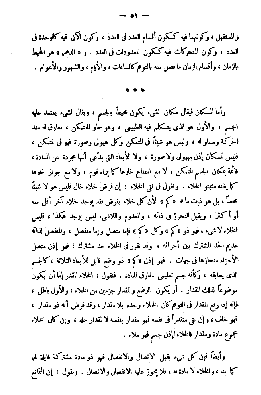 وأما المكان، فيقال مكان لشيء يكون محيطا بالجسم، ويقال لشيء يعتمد عليه الجسم, والأول هو الذي يتكلم فيه الطبيعي، وهو حاو للمتمكن مفارق له عند الحركة ومساو له، وليس هو شيئا في المتمكن، وكل هيولى وصورة فهو في المتمكن، فليس إذا المكان إذا بهيولى وصورة، ولا الأبعاد التي يدعى أنها مجردة عن المادة قائمة بمكان الجسم المتمكن، لا مع امتناع خلوها كما يراه قوم، ولا مع جواز خلوها كما يظنه مثبتو الخلاء. ونقول في نفي الخلاء إن فرض خلاء خال، فليس هو لا شيئا محضا، بل هو ذات ما له كم، لأن كل خلاء يفرض فقد يوجد خلاء آخر أقل منه أو أكثر، ويقبل التجزؤ في ذاته. والمعدوم واللا شيء ليس يوجد هكذا، فليس الخلاء لا شيء، فهو "ذو" كم. وكل "كم" فإما متصل وإما منفصل، والمنفصل لذاته عديم الحد المشترك بين أجزائه، وقد تقرر في الخلاء حد مشترك، فهو إذا متصل الأجزاء منحازها في جهات، فهو إذن "كم" ذو وضع، قابل للأبعاد الثلاثة، كالجسم الذي يطابقه، وكأنه جسم تعليمي مفارق للمادة. فنقول الخلاء المقدر إما أن يكون موضوعا لذلك المقدار، أو يكون الوضع والمقدار جزأين من الخلاء، والأول باطل، فإنه إذا رفع المقدار في التوهم كان الخلاء وحده بلا مقدار، وقد فرض أنه ذو مقدار، فهو خلف، وإن بقي متقدرا في بنفسه لا لمقدار حله، وإن كان الخلاء مجموع مادة ومقدار فالخلاء إذا جسم فهو ملاء.